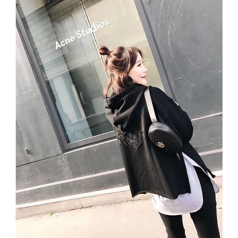 Part of the GG Marmont line, the belt bag was presented for the first time by Alessandro Michele in the Pre-Fall 2017 collection. It has a sportswear-inspired rounded shape with a leather belt which is designed so the bag can be worn high on the waist. It features the recognizable Double G detail-an archival play on the Running G.