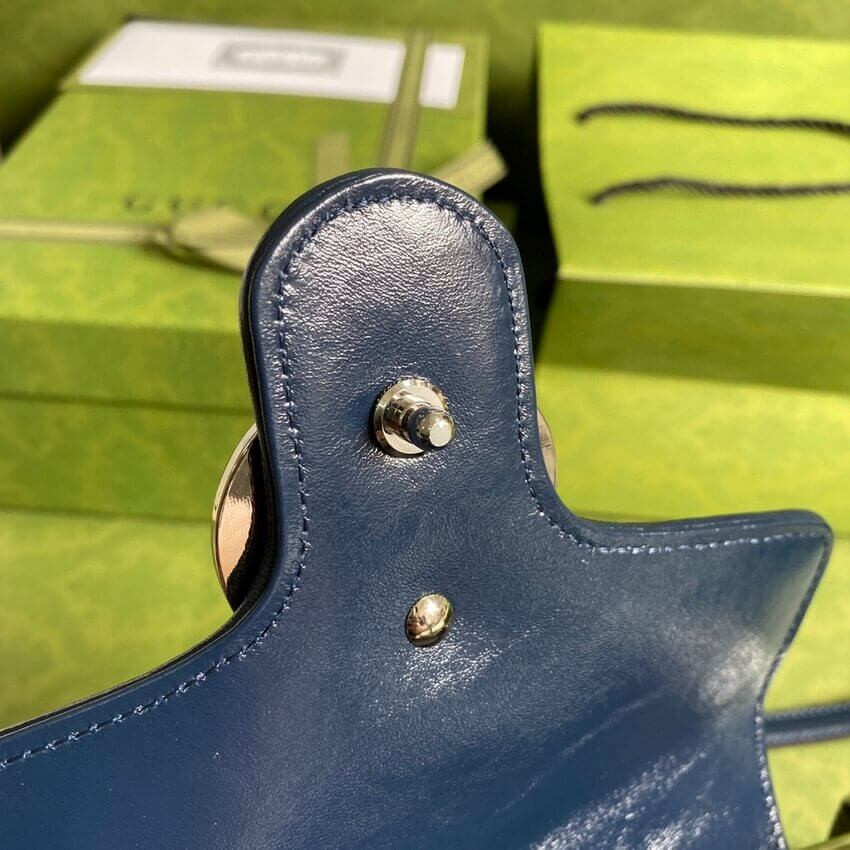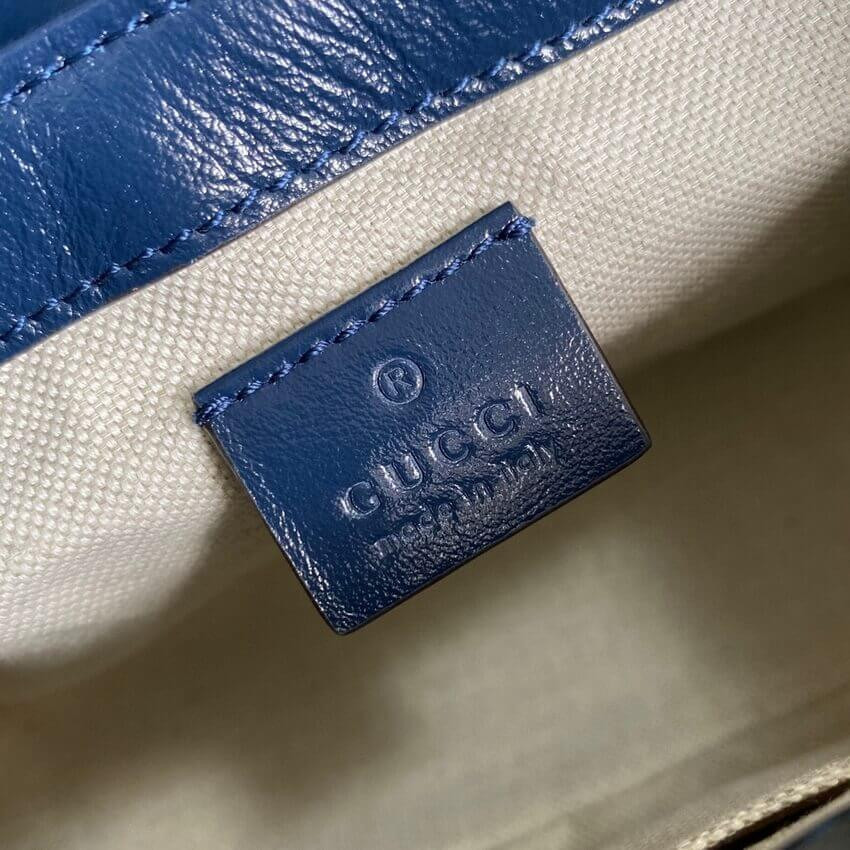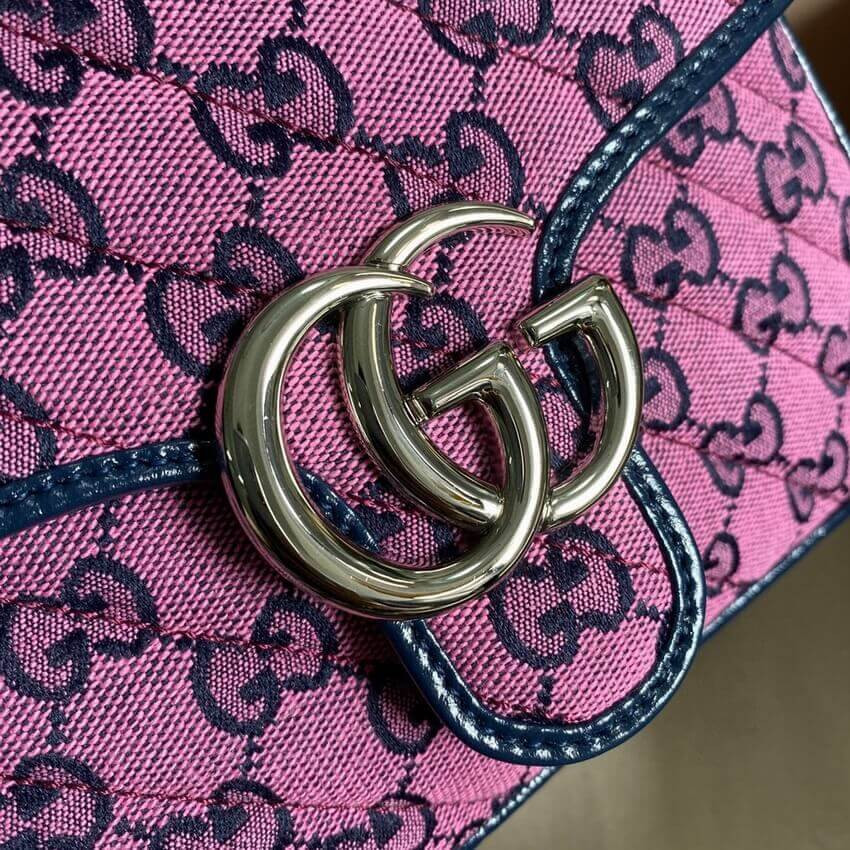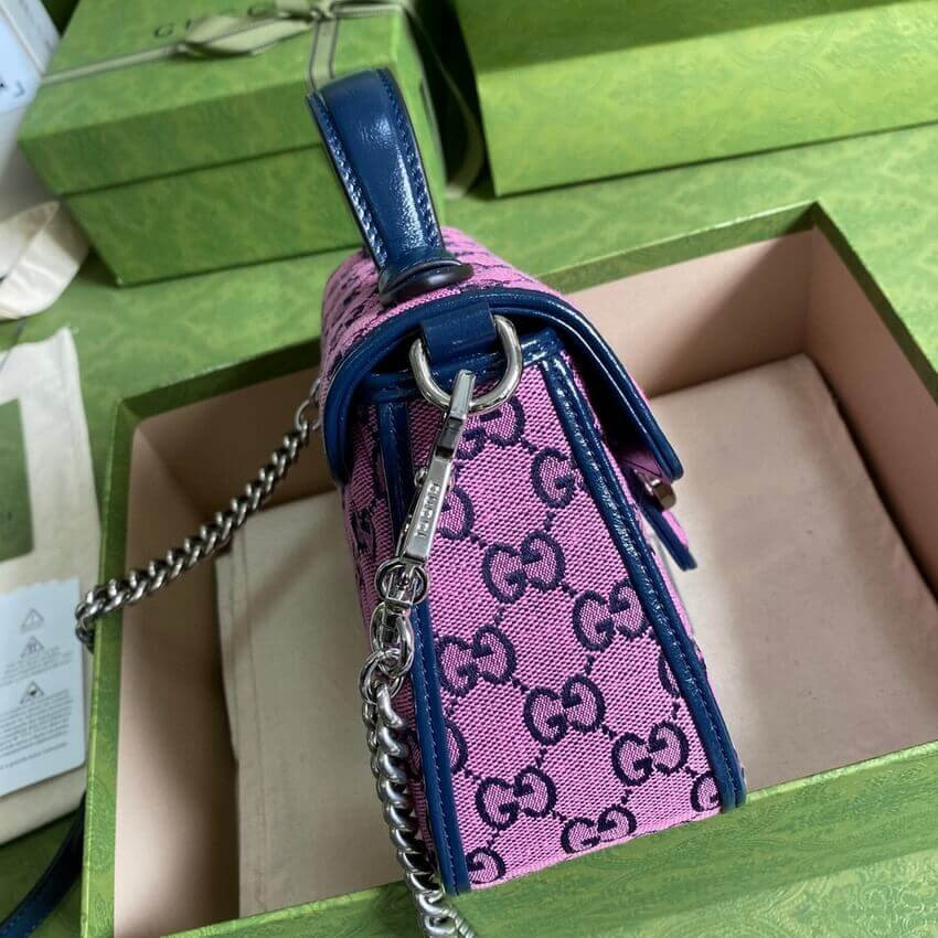 Embracing the new possibilities that lie within variations of the Gucci archives, various pieces throughout the collection provide a new lens through which to view the emblematic GG rhombi motif. Already an evolution of the House logo, it is once again reimagined in a series of bright colors—a theme that has become synonymous with the Creative Director’s vision. This GG Marmont mini top handle bag is part of the GG Multicolor collection.