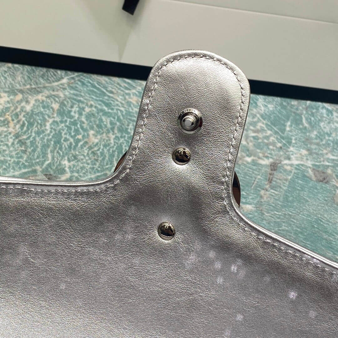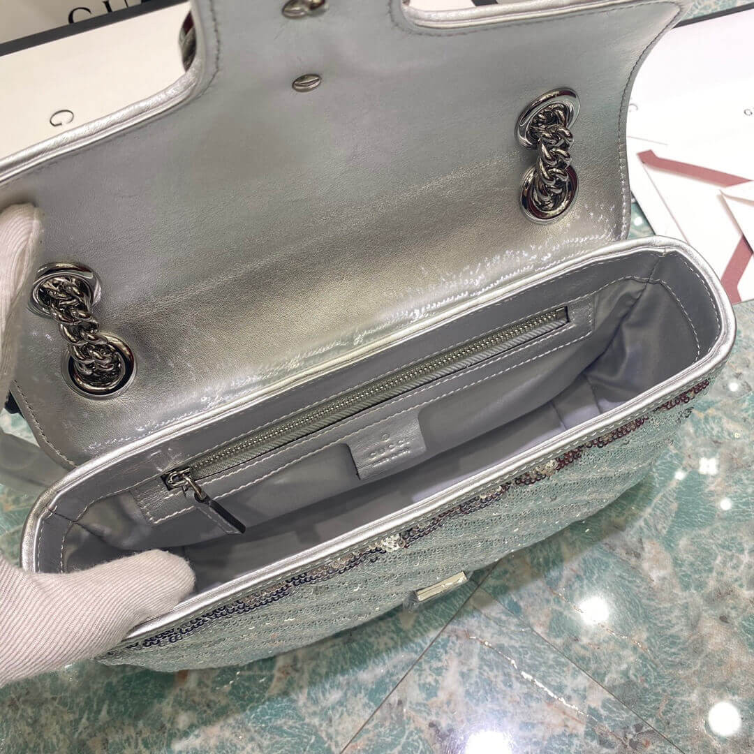 A message about leaving fashion’s old rules behind, Epilogue conveys the idea that pieces should be timeless–not just in fashion for one season. The collection highlights Alessandro Michele’s most emblematic styles and motifs from the past 5 years, like the GG Marmont. The recognizable design is presented in silver with shining sequins against a silk base. The small shoulder bag is completed by the recognizable Double G hardware.