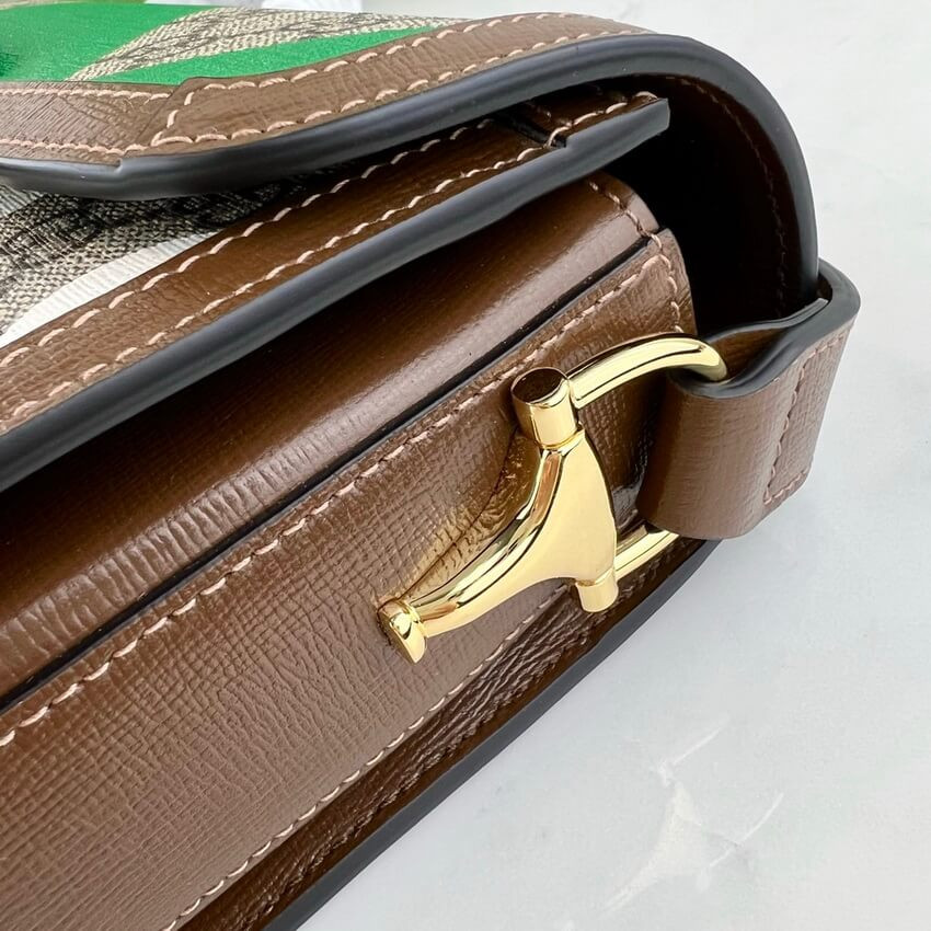 This item features bright and colorful geometric motifs that recall the uniforms worn by horse riding jockeys. The collection is inspired by the Parade Ring, or paddock, where horses walk around as a warm-up before the race and to help racegoers pick a winner. Here the print appears on this Gucci Horsebit 1955 shoulder bag.