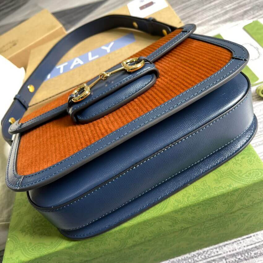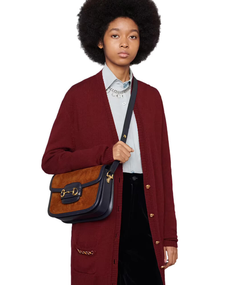 Recreated from an archival design, the Gucci Horsebit 1955 bag is introduced in pink corduroy with a contrasting blue leather trim. With the same lines and forms first introduced over six decades ago, the accessory unifies the original details with a modern spirit, highlighting the Horsebit. The small flap shoulder bag is completed with a special mechanism that adjusts the length of the shoulder strap so it can be carried on one shoulder or cross body.