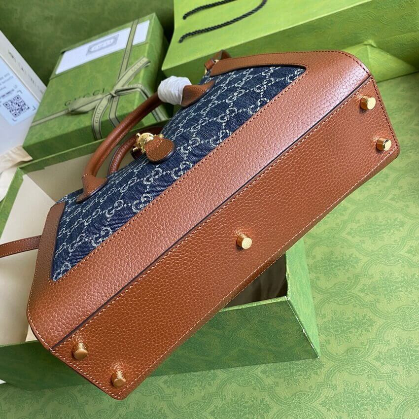 The world of Jackie 1961 continues to evolve with a monogram tote bag. A cult fabric, denim is reimagined through the Gucci lens with the House's GG motif. Here, the logo infused fabric is paired with the bag's emblematic piston hardware.