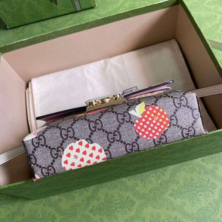 An emblem of the Gucci's playful spirit, fruits and vegetables have become contemporary House codes that animate the latest collections. Speaking to this theme, this mini Padlock shoulder bag is defined by a whimsical apple motif.