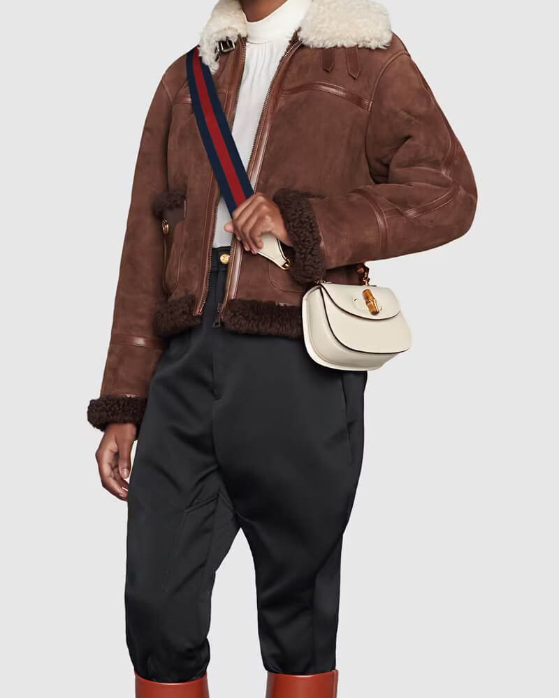 Heritage elements are reimagined with a contemporary twist throughout the Aria collection. An emblem of Gucci's origins, bamboo has appeared throughout the House's collections since the '40s. After over eight decades, the material defines this leather mini bag. The accessory is presented in a delicate shade of pink, enriching it with a soft dreamlike feel.