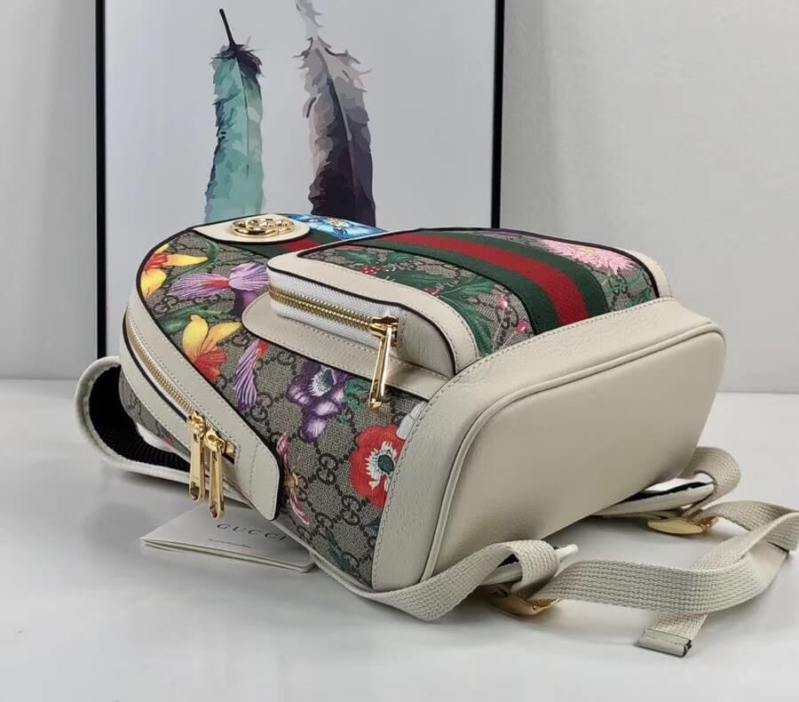 A special collection combines two of the House's most distinctive designs into an unexpected and contemporary fabric, animating classic silhouettes like the small backpack. The historic Flora motif, first presented by Vittorio Accornero more than 50 years ago, is layered over the House monogram and trimmed with white leather for a modern take on the two archival patterns.