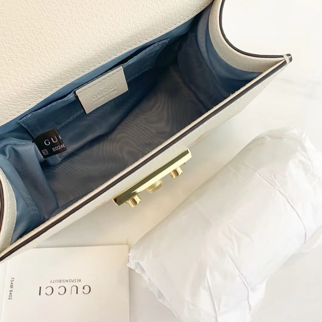 Characterized by structured silhouettes and a key lock closure pulled straight from the House's archives, the distinctive Padlock shapes are revamped season after season. For Cruise 2019, the small shoulder bag is presented in textured leather printed with metallic gold bees and stars. The key is placed in a detachable leather key case.