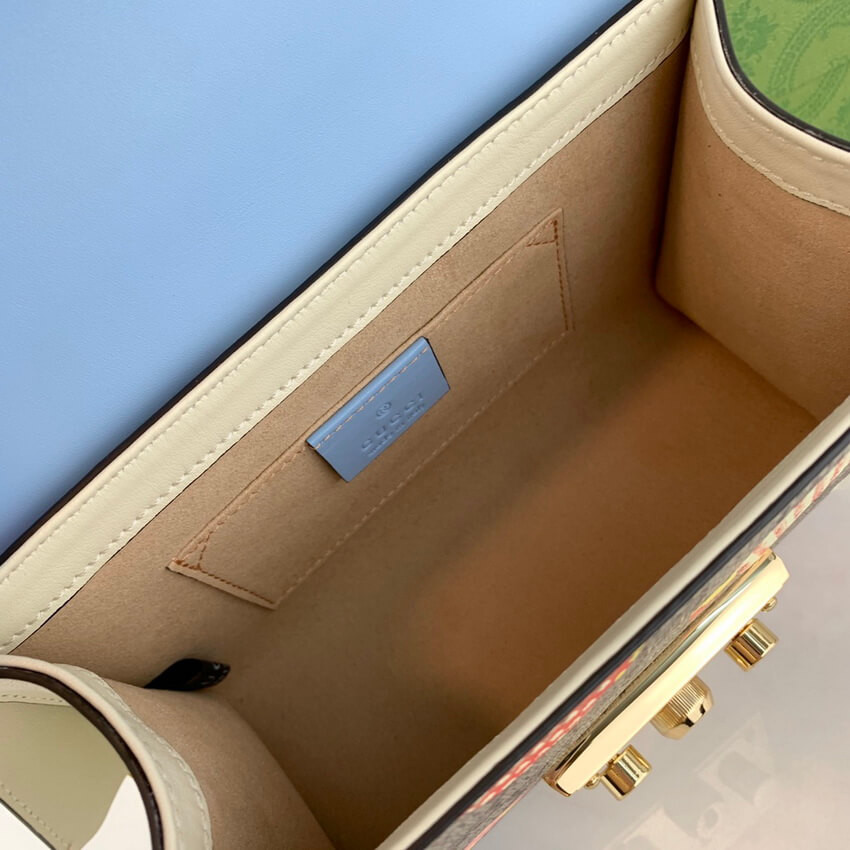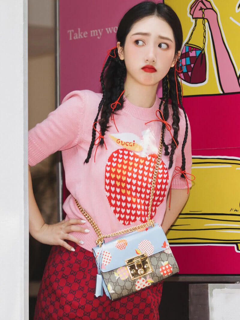 Fruits and vegetables become the brand's current fashion design elements, injecting full vitality into the new series, vividly interpreting the brand's innocent and fun mood. This small Padlock series shoulder bag uses an interesting Gucci heart apple pattern to echo the theme.