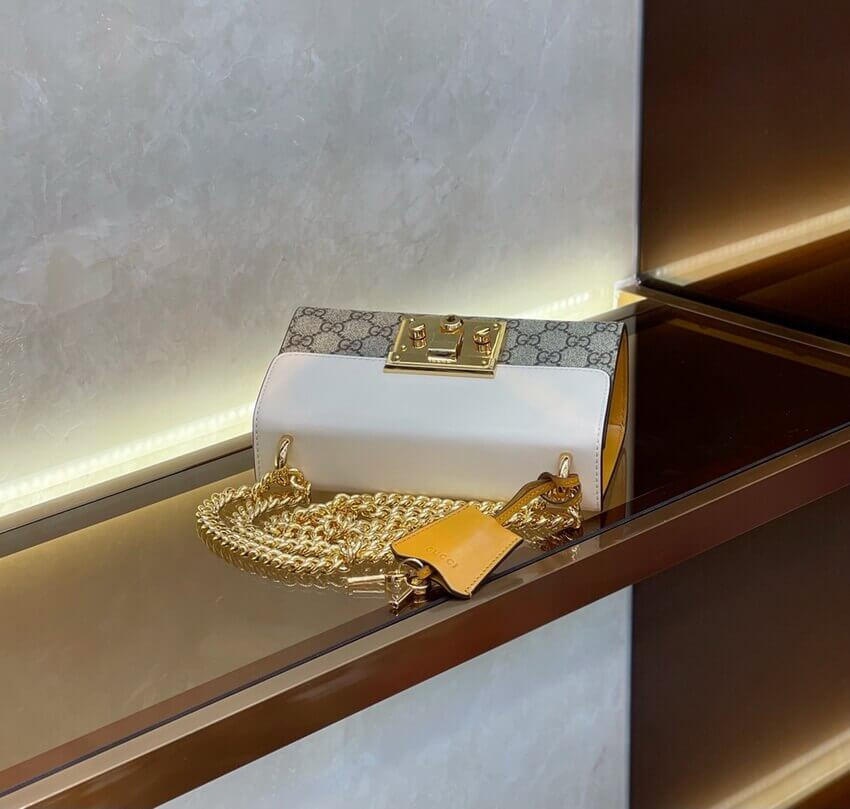 A small structured GG Supreme canvas bag with a leather top and our key lock closure. The sliding chain strap can be worn multiple ways, changing between a shoulder and a top handle bag.