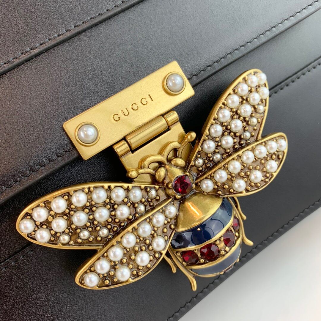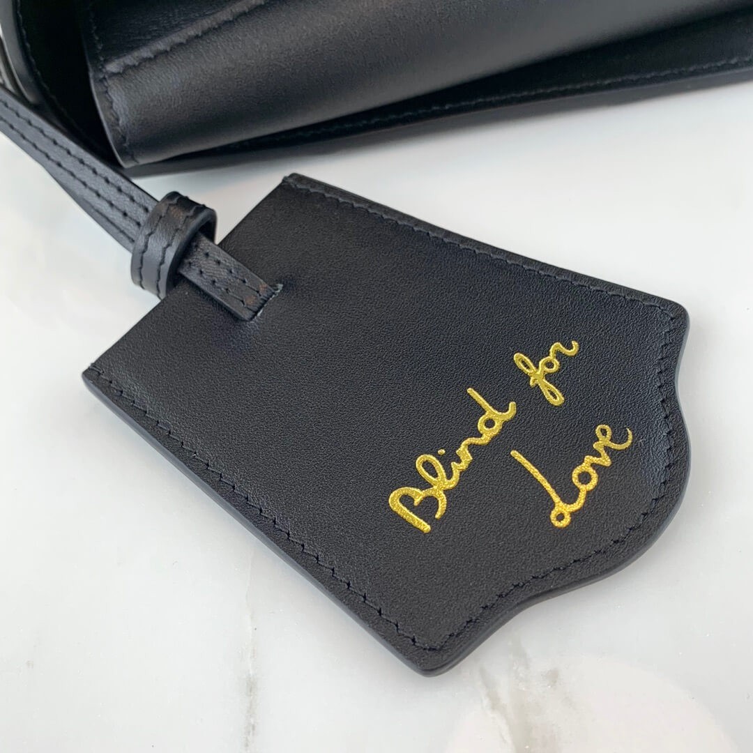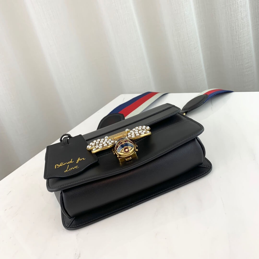 The Queen Margaret line mixes iconic Gucci details with newly established codes. The bee-a historical Gucci code taken from the '70s archives-is enriched by glass pearls and multicolor crystals. An ID holder with gold embossed "Blind For Love", a reference to inclusive romanticism, hangs over the top handle. Made in smooth leather with a slight shine in a color block design.