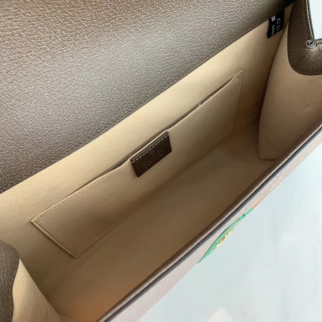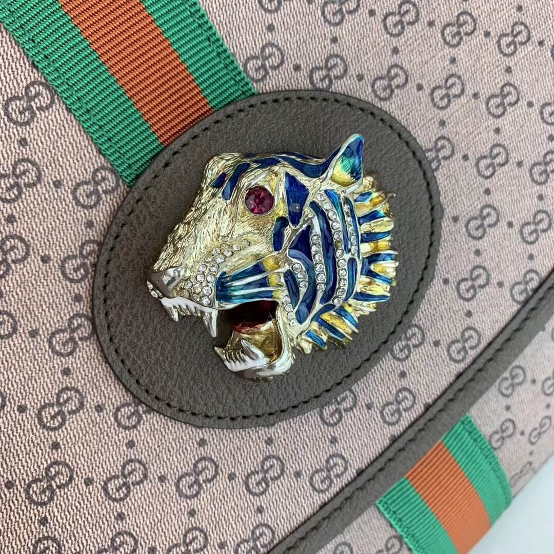 An addition to the Rajah line for Spring Summer 2019, the medium shoulder bag is introduced in mini GG Supreme canvas—a new take on the signature pattern with a vintage look that is heightened with the green and orange Web. Featuring the collection's colored enamel and crystal tiger head, inspired by a vintage piece from legendary fashion and jewelry designer Hattie Carnegie's 1940s archives, the bag is designed with two straps: one short chain strap and a longer shoulder strap in the House's signature green and red Web colors.