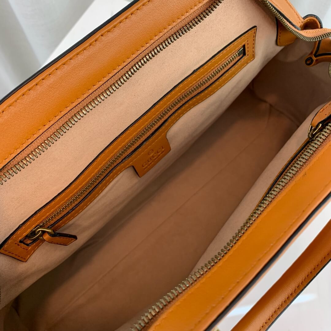 A soft construction with a framed design defines the top handle bag, crafted from supple natural grain leather with a washed and brushed finish that lends a slightly worn yet refined feel to the shape. Subtle references to the House further enrich the sides of the bag. The Double G an archival reprisal of the House's signature emblem embellishes one side while the other portrays the feline head.