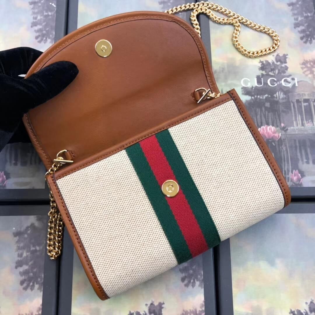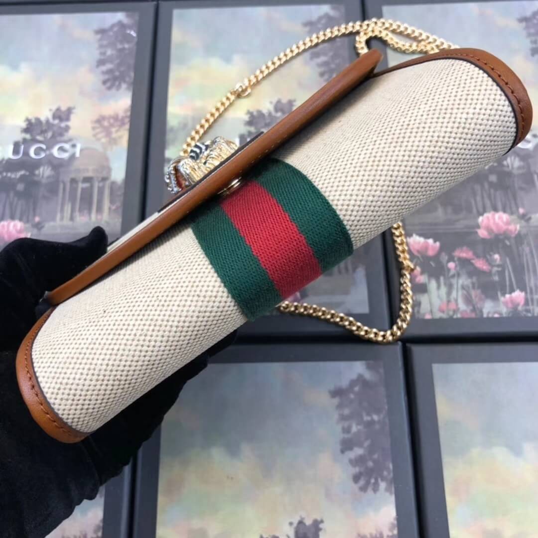 A mini bag crafted from a woven vintage inspired canvas. The Rajah universe continues to evolve with new iterations each season. Defined by the combination of the House Web and the enameled tiger head, inspired by a vintage piece from fashion and jewelry designer Hattie Carnegie’s 1940s archives, the accessory is finished by a detachable chain strap. New shapes and signature Gucci lines are reimagined in a mix of fabrics and trims imbued with an inherently summer feel.