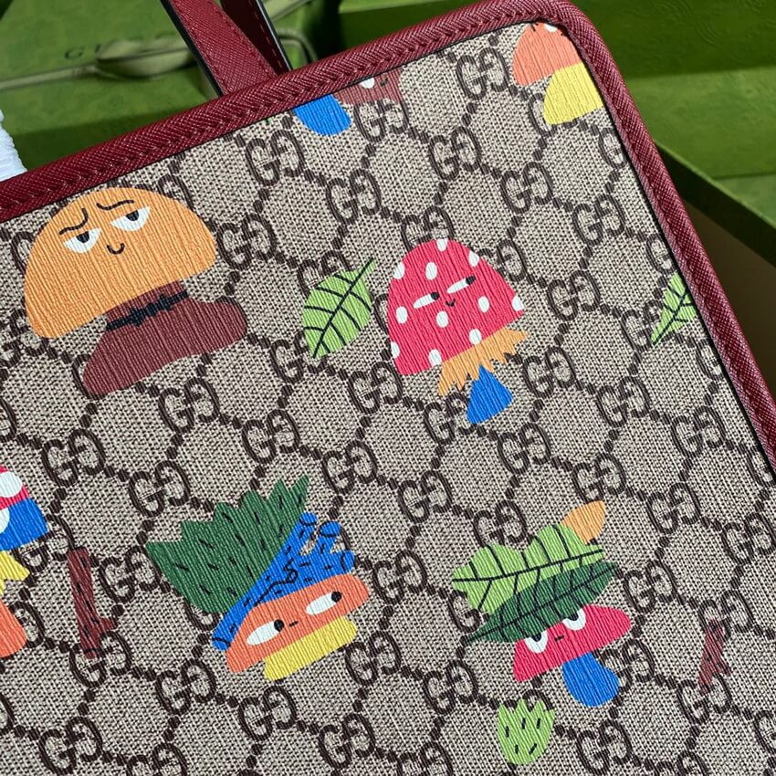 Children's storybooks continue to inspire the House. Here. this children's tote bag pairs the GG monogram motif with a cartoon-inspired woodland print. The joyful pattern features plants from the forest as dancing characters.