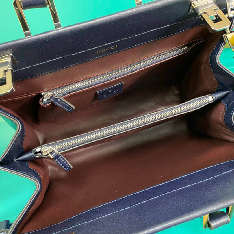 The Gucci Zumi small top handle bag is introduced in a tricolour variation with cerise and butter diagonal stripes set against a dark blue smooth leather base. The Interlocking G Horsebit, a combination of two of the House's most distinctive codes, is presented in a dynamic mix of gold- and silver-toned metals against the refined silhouette. First introduced in the evocative setting of the Théatre Le Palace in Paris, the Gucci Zumi line takes its name from actress and experimental musician Zumi Rosow, who walked the Spring Summer 2019 runway carrying the bag.
