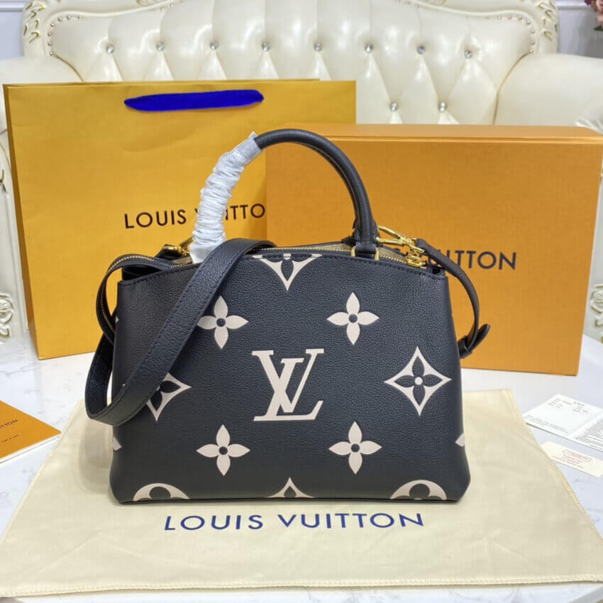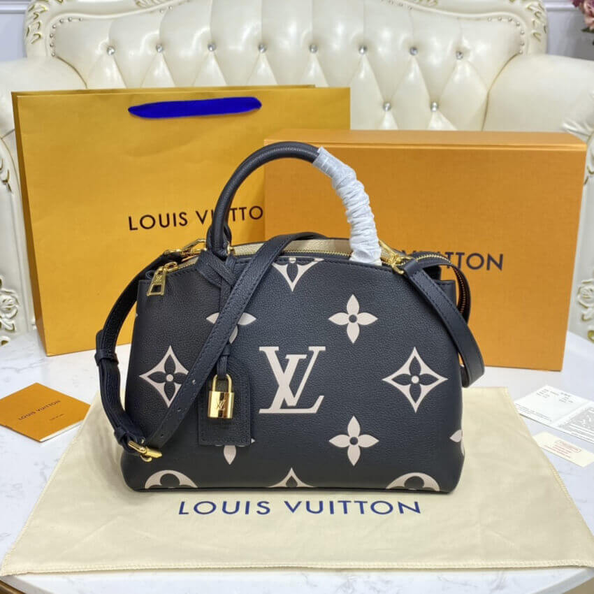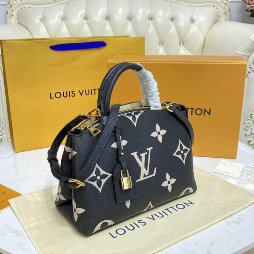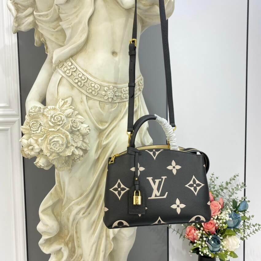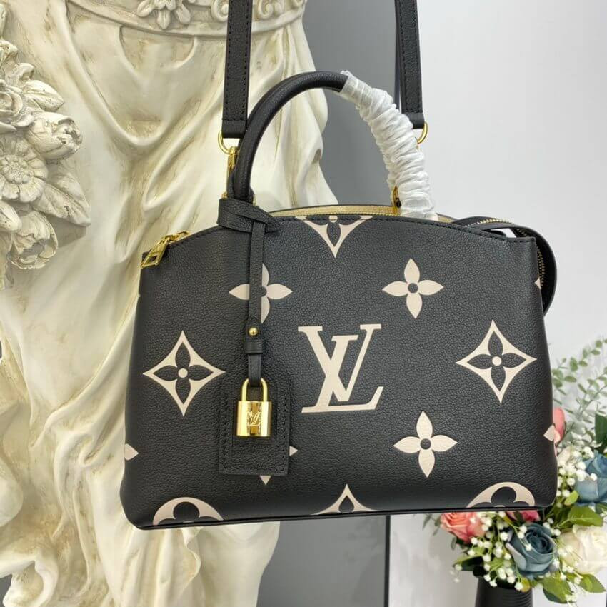 The perfect everyday companion, the smart and sophisticated Petit Palais handbag is fashioned from grained leather with an oversized pattern of Monogram Flowers and LVs printed and embossed on it. The gold-color padlock and leather name tag bring to mind the House’s legacy of fine luggage. A detachable strap can be adjusted for comfortable shoulder and cross-body wear.