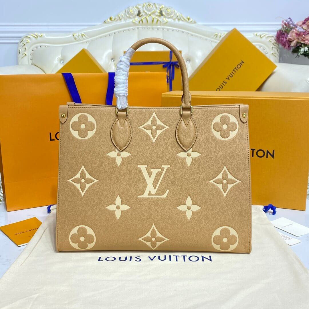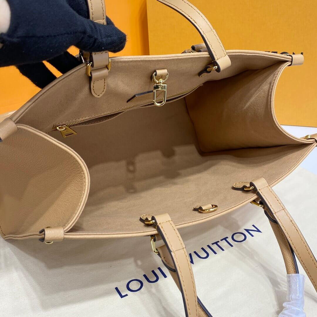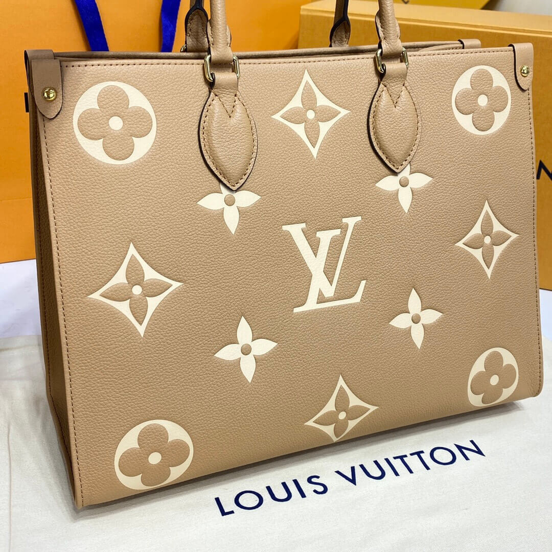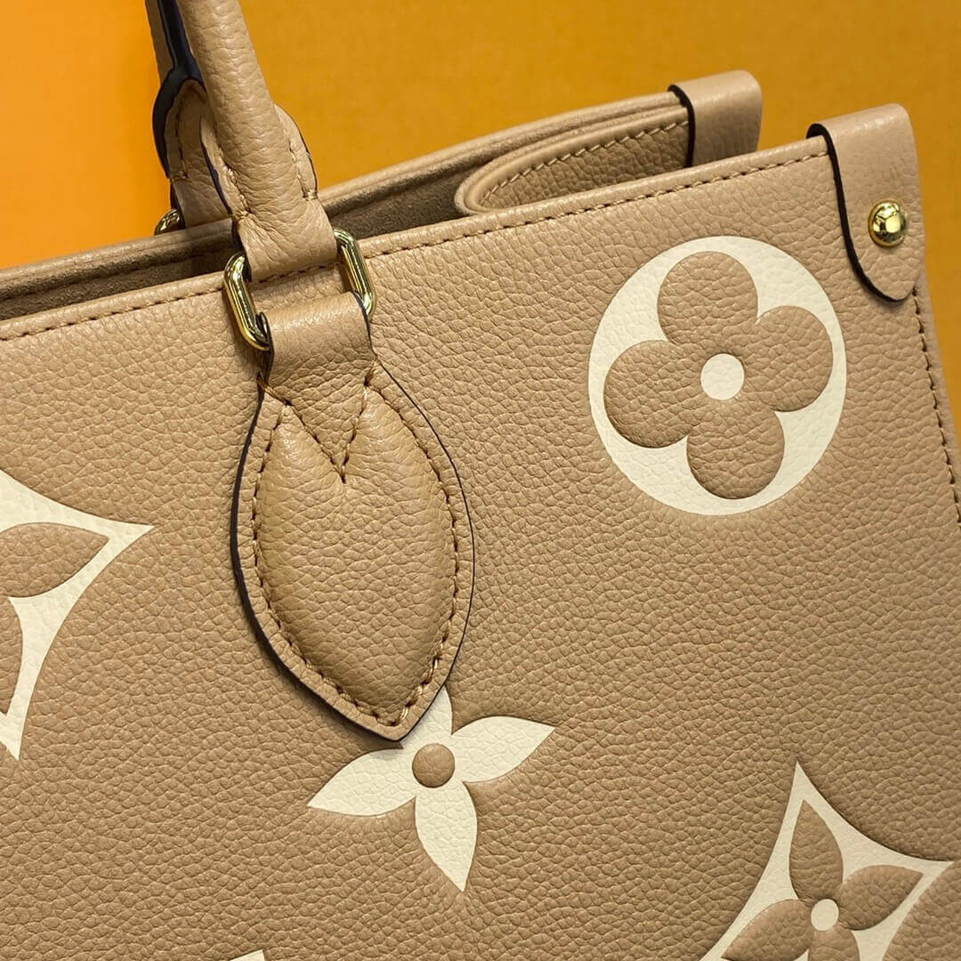 Made from Monogram Empreinte grained leather in a warm two-color combination, this OnTheGo MM tote bag features the Monogram pattern embossed and printed onto the leather. Its boxy shape means it’s roomy and can easily fit a laptop. It has two leather top handles for hand carry as well as two long shoulder straps.