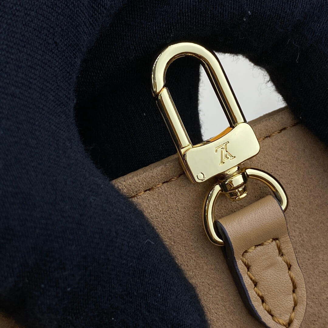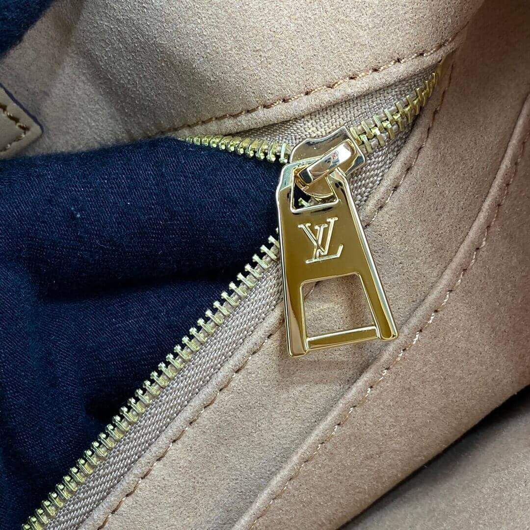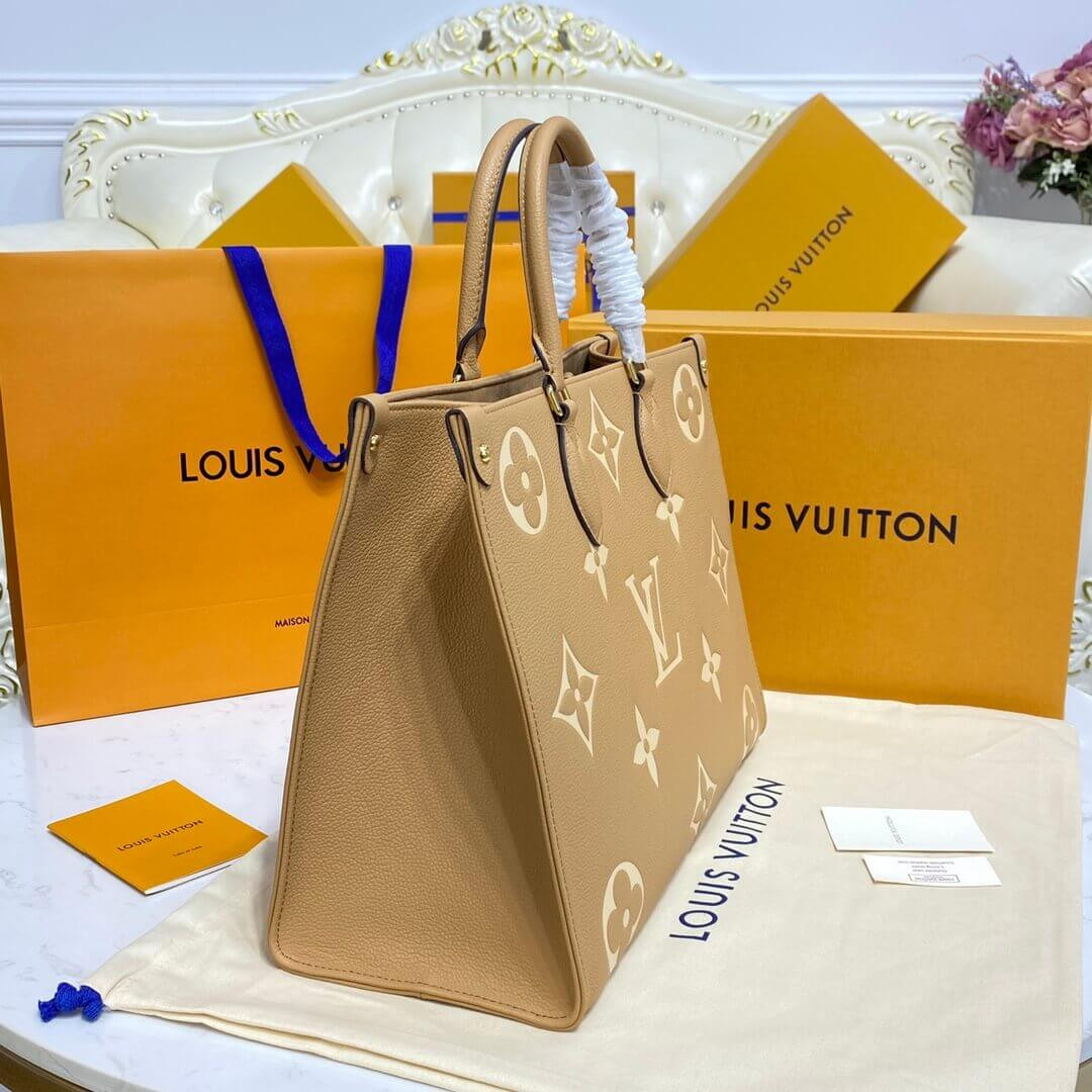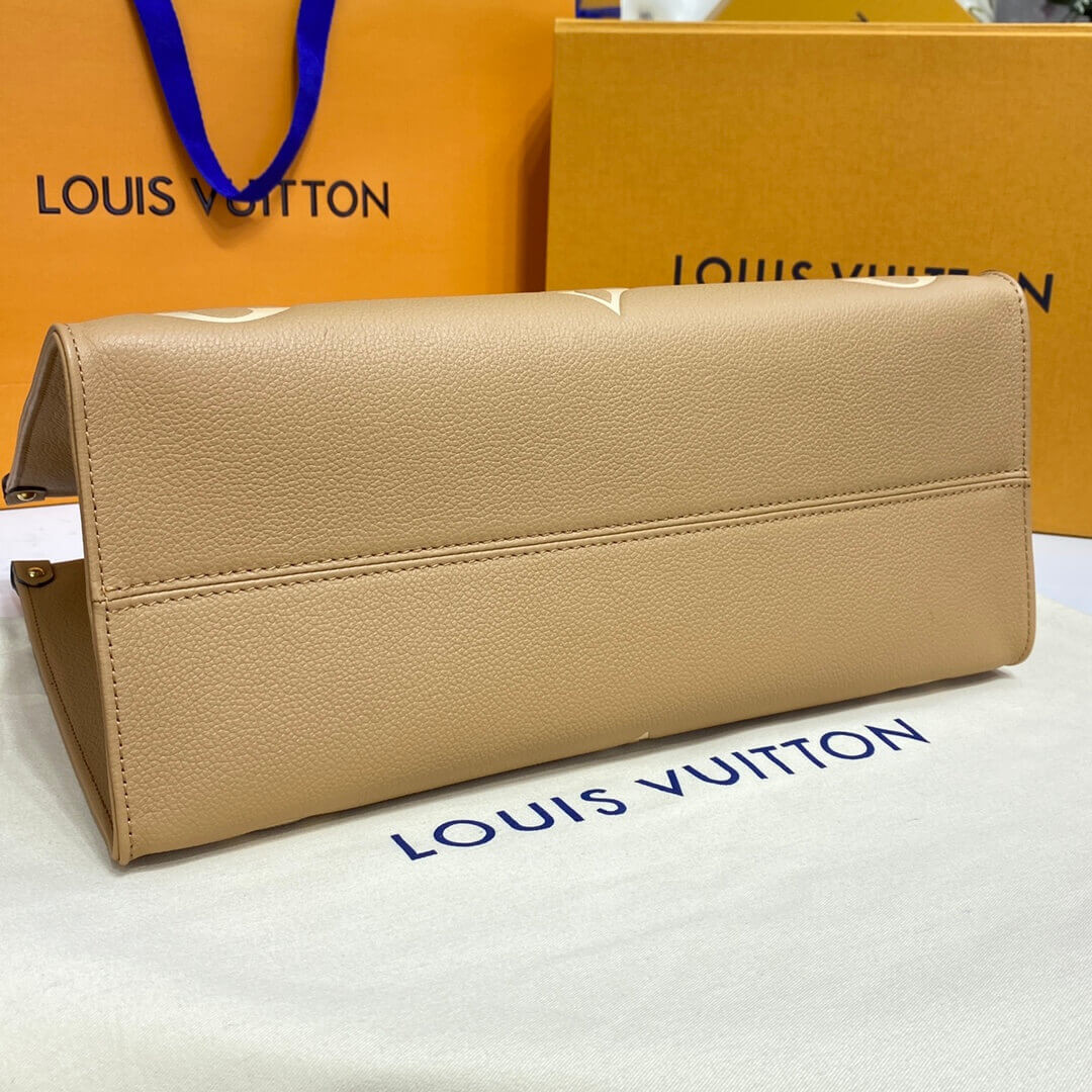 Made from Monogram Empreinte grained leather in a warm two-color combination, this OnTheGo MM tote bag features the Monogram pattern embossed and printed onto the leather. Its boxy shape means it’s roomy and can easily fit a laptop. It has two leather top handles for hand carry as well as two long shoulder straps.