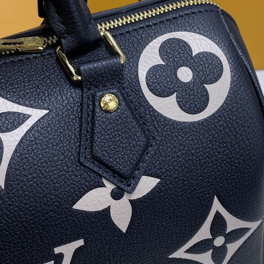 The compact Speedy Bandoulière 25 handbag is made from black Monogram Empreinte leather with the embossed Oversized Monogram pattern in beige. This sophisticated handbag was inspired by the House’s “Express” bag from 1930. Finished with gold-color hardware, the interior is lined in red. A detachable and adjustable shoulder strap, in addition to the top handles, enables carry options.