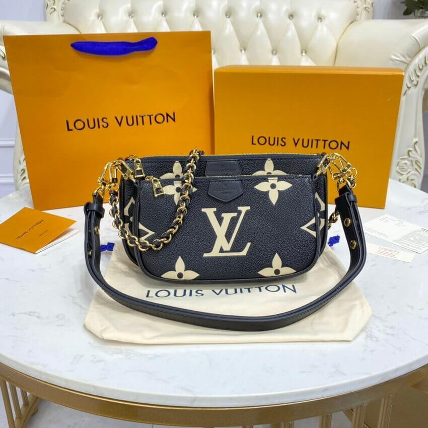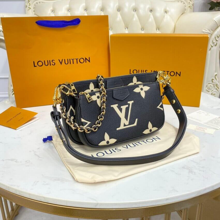 The Multi Pochette Accessoires cross-body bag takes on a striking aspect in embossed black Monogram Empreinte leather, overprinted with the Monogram motif in a cream color. Just the right size to carry a woman’s essentials, this two-in-one bag keeps things organized with its removable pouches. It’s comfortable to wear thanks to its suppleness and light weight.