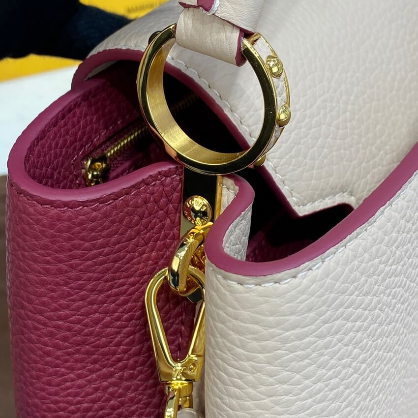 This Capucines BB handbag is made from Taurillon leather and features a wide colorful strap, with Louis Vuitton embroidered on one side and a graphic design of triangles and Monogram Flowers on the other. Named after a mountain range, the Karakoram pattern takes several hours to be embroidered on each strap.