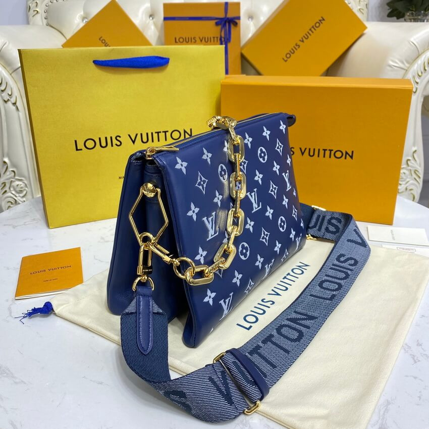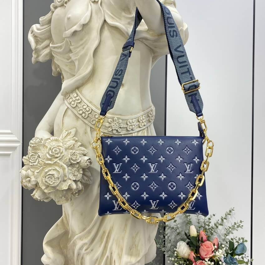 This Coussin PM handbag is made from printed lambskin recreating the Denim effect, with tone-on-tone navy trim. It has a removable wide textile strap for shoulder and cross-body wear as well a detachable long chunky chain for shoulder carry. The new Coussin shape was one of the stars of the Spring-Summer 2021 Collection.