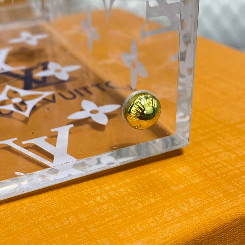 This glamorous Cube Scott box is fastened with a gold-color hardware S-Lock reminiscent of those found on the House's historical trunks. It is a new twist on the classic Bo?te Scott, a piece originally used for storing perfume bottles. The see-through Plexiglas walls are engraved with an allover Monogram pattern for a distinctive look.