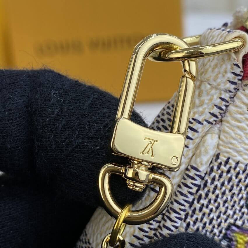Crafted from Damier Azur canvas, the Mini Pochette Accessoires features a limited edition print of House mascot Vivienne visiting Hollywood. In front of the LV Diner, she watches as a California bear arrives in a vintage automobile. This small pouch can be carried like a clutch or attached to another bag with its chain.
