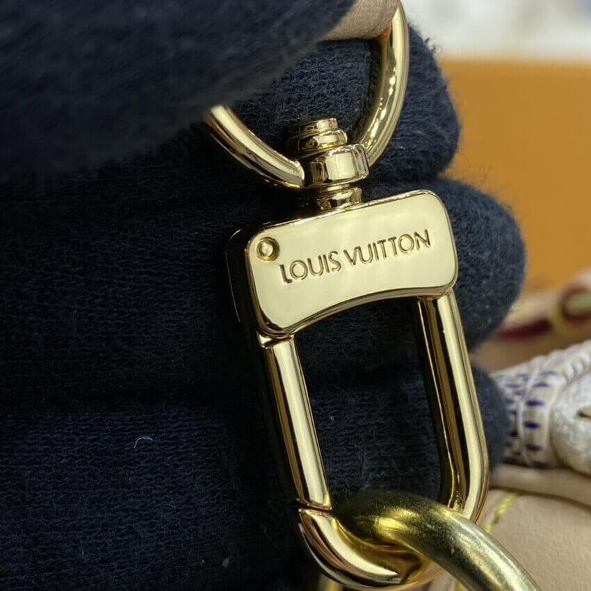 The iconic Speedy bag is given a fresh, feminine feel for summer in Damier Azur canvas overlaid with a surprising Monogram print adapted from the archives.