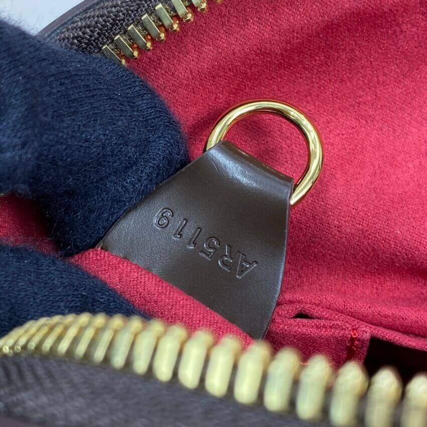 - Damier canvas with smooth leather trimmings and red microfiber lining
