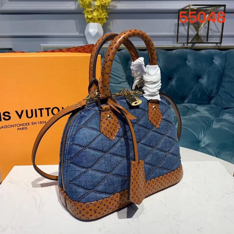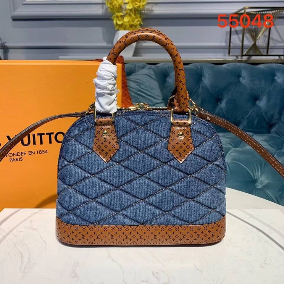 The timeless Alma BB handbag is updated for Pre-Fall 2019 with Malletage-quilted dark denim canvas. The tan calf-leather handles and trim are printed with a minuscule Monogram motif, a playful signature touch. The charming BB size can be styled in a multitude of ways: carried by hand, slung over a shoulder or worn cross-body.