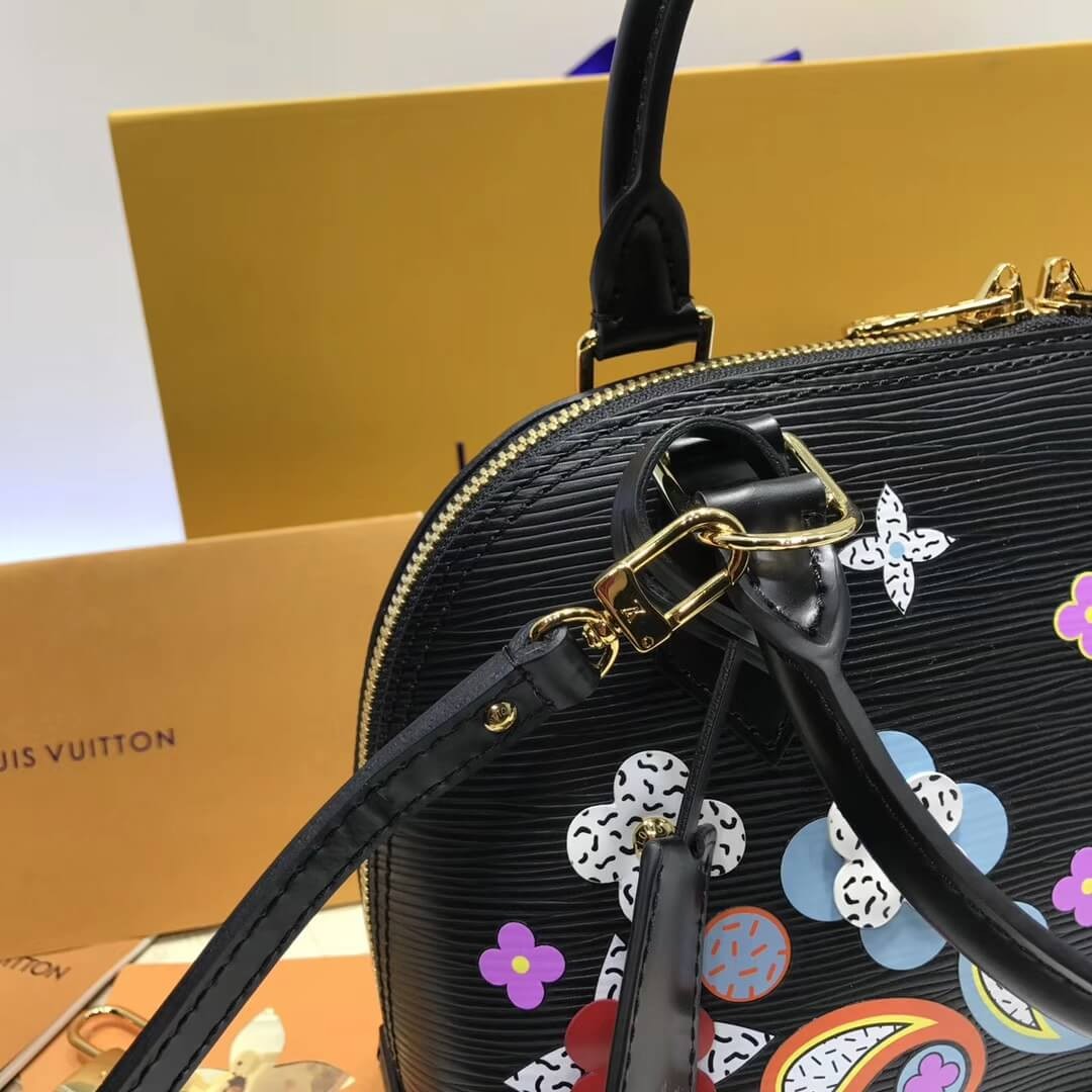 This Alma BB blends vibrant colors with crafted leather patches work to bring a fresh feminine interpretation of the emblematic Louis Vuitton Monogram flower.