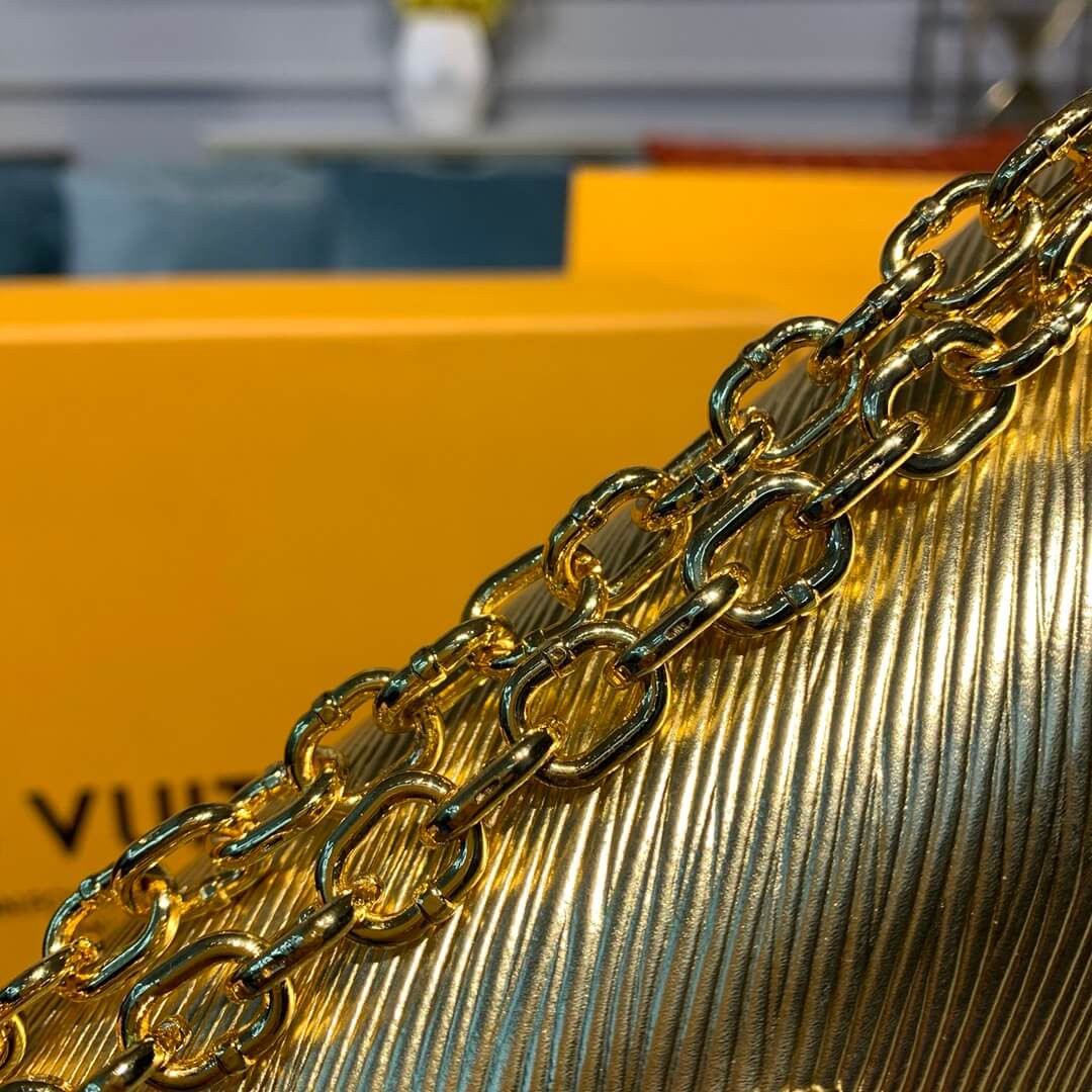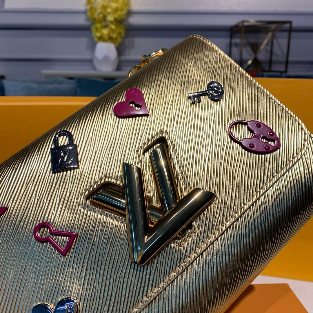 The Twist MM handbag comes in gold Epi leather as part of the LV Love Lock collection. The grained leather is ornamented with tiny locks, keys and Monogram Flowers in pink and silver-tone metal. This neatly proportioned bag can be carried on the shoulder or across the body thanks to its sliding chain.