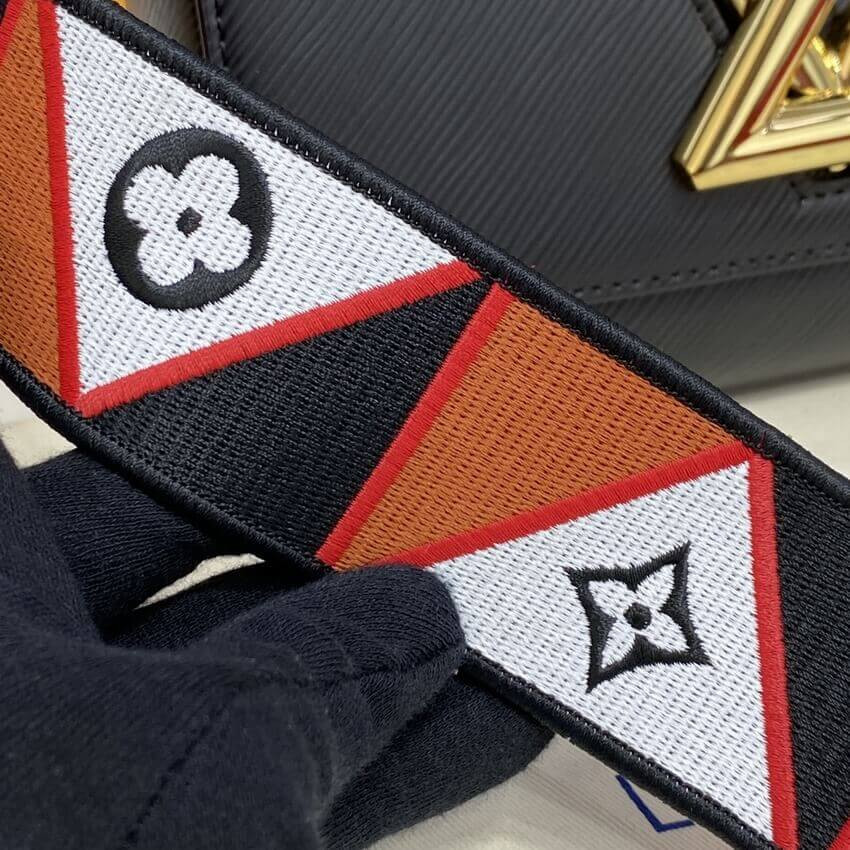 This season the Twist MM handbag is accessorized with a wide strap. Louis Vuitton is embroidered on one side and the geometric Karakoram design including Monogram Flowers on the other. Fashioned from Epi grained leather, it has a detachable bicolor Epi leather handle for hand carry. The gold-color LV Twist lock completes the design.
