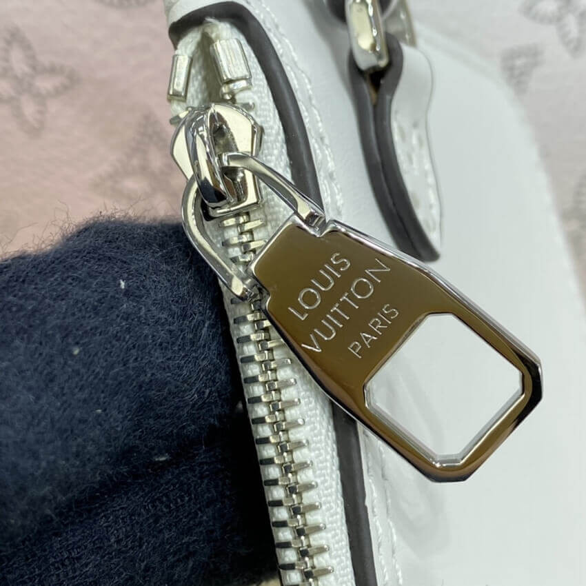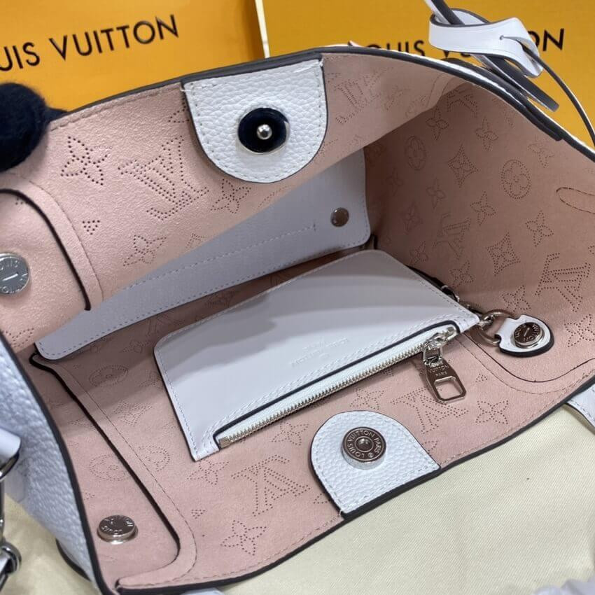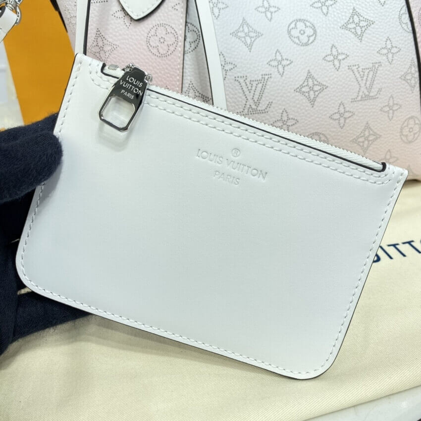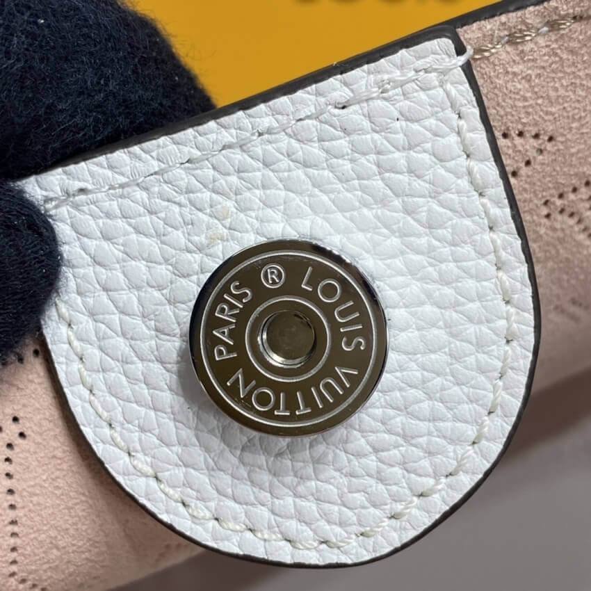 The Hina PM handbag takes on a playful look in perforated Mahina calf leather. The gradient color evolves from a darker pastel at the bottom of the bag to something lighter up top. Gather and fasten the sides, and this versatile bag transforms from a small tote into an adorable bucket bag.