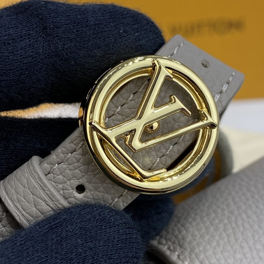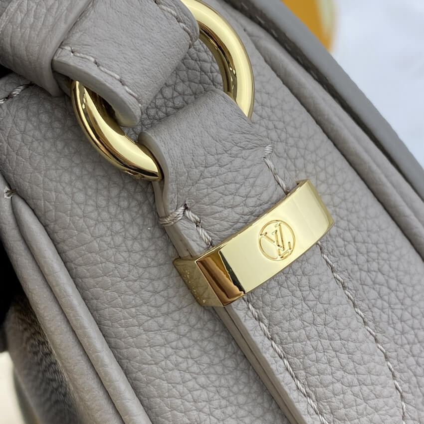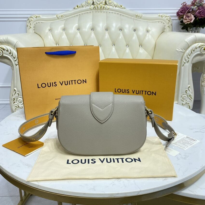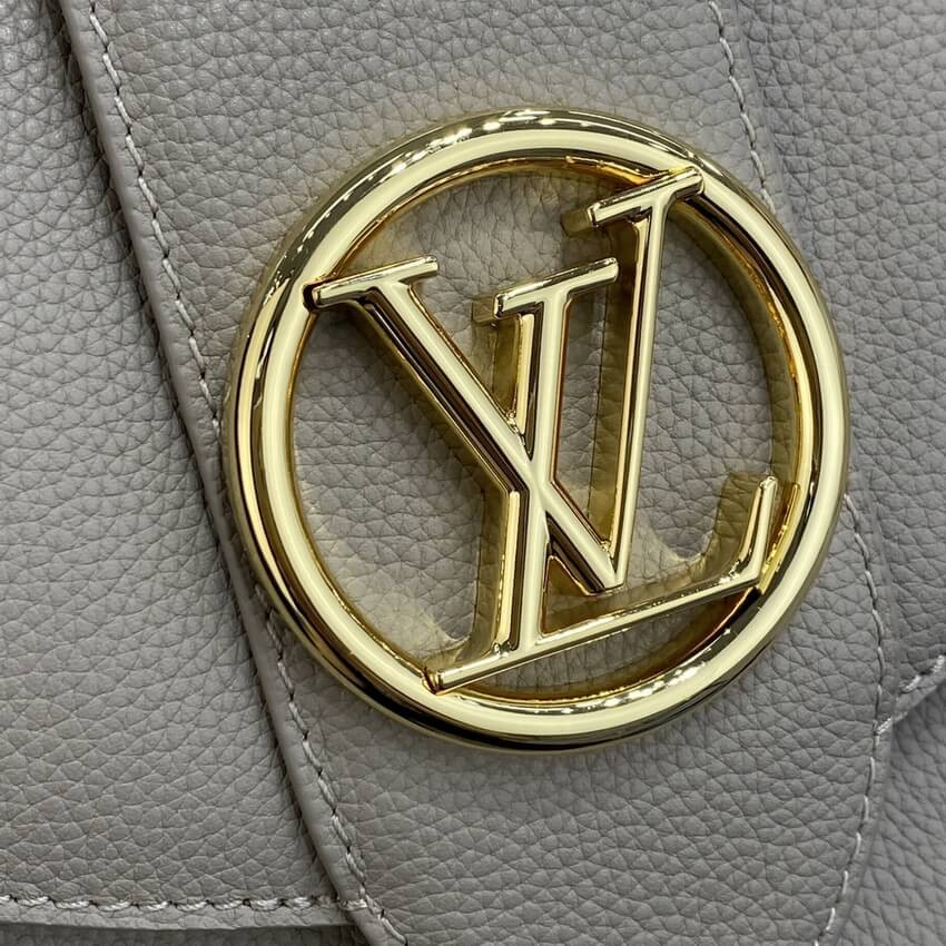 The LV Pont 9 Soft MM is a rounded handbag made from grained calfskin with smooth cowhide lining in a contrasting color and a wide two-color strap decorated with Monogram Flowers. The two sides of the strap are woven separately and then stitched together by hand. The new LV Circle signs this bag.
