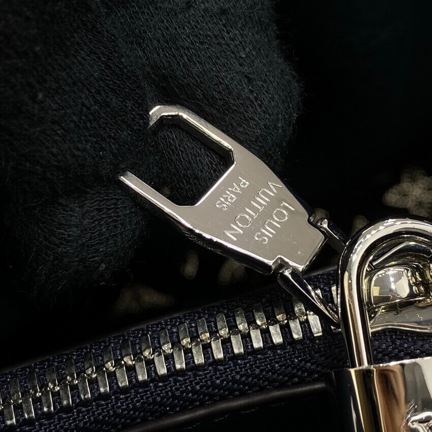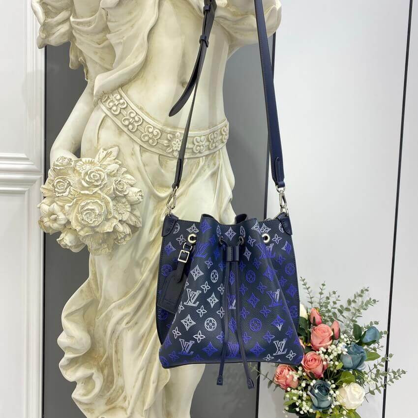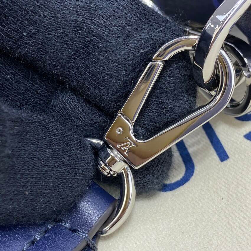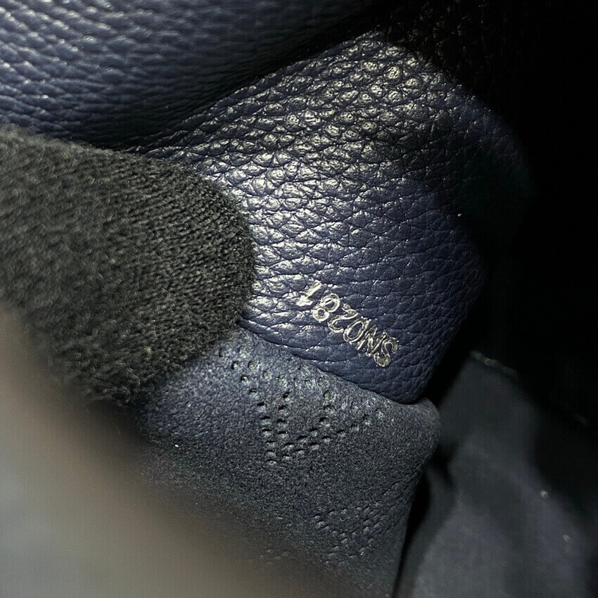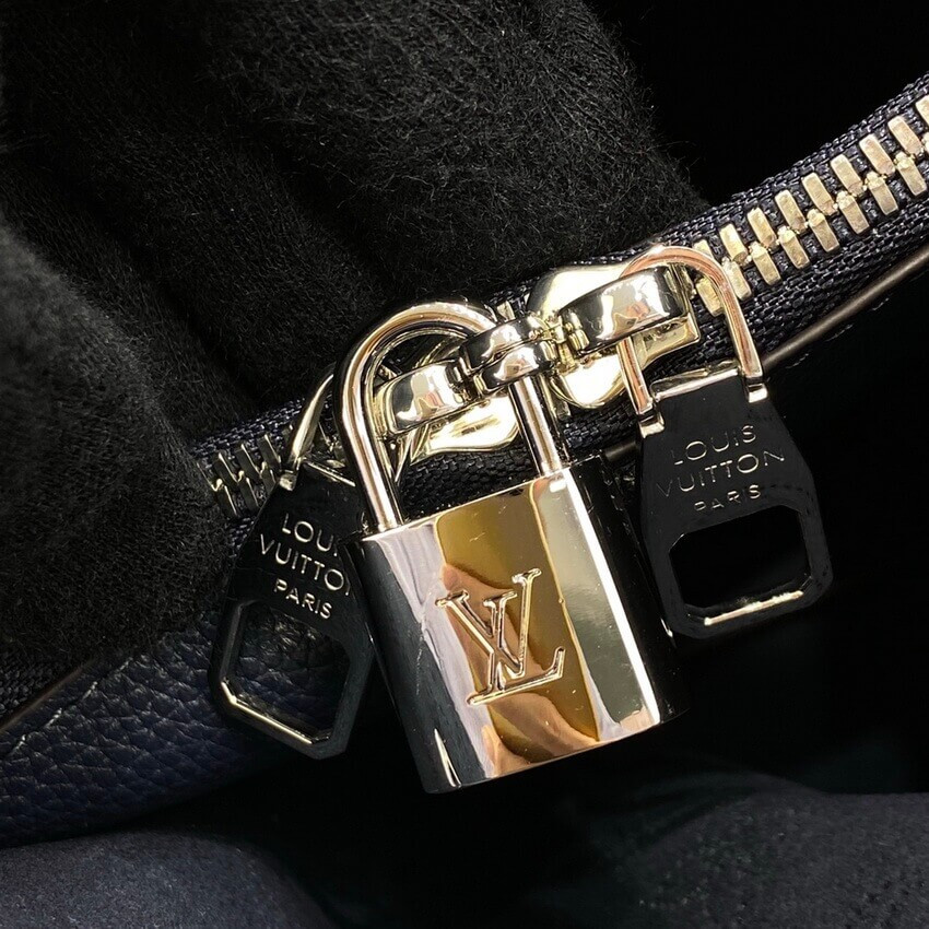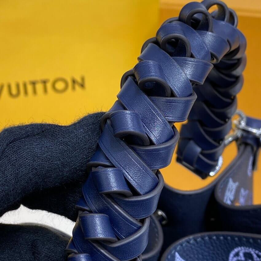 Perfect for plane travel, the Muria tote bag is made from supple Mahina perforated calfskin. The perforated Monogram pattern in the navy-blue calfskin is highlighted by the gradient whites and blues on the LVs and Monogram Flowers. A braided handle enables hand and elbow carry while a removable leather strap allows comfortable shoulder and cross-body wear.