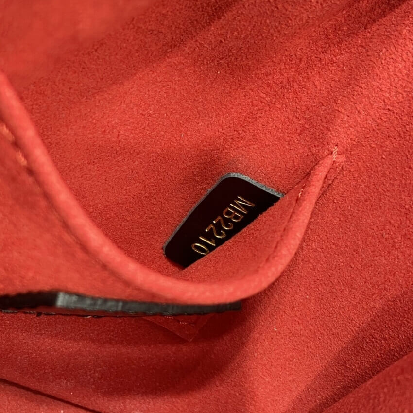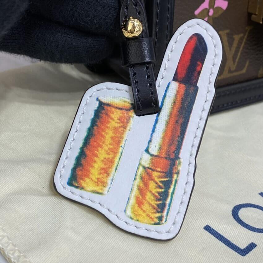 The Dauphine Mini handbag is made from Monogram canvas, with certain Monogram Flowers in the pattern rendered in feminine pink and vibrant red. It features the Dauphine’s instantly recognizable LV circle lock and is signed with a “Louis Vuitton” that seems to be written with the playful lipstick charm.