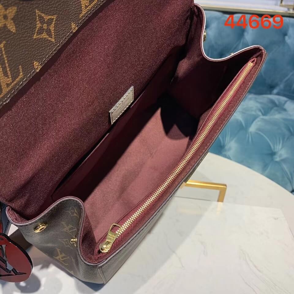 With its top handle in braided leather, the Cluny MM handbag in Monogram canvas is a study in elegance. The navy blue removable leather strap and oversized leather LV charm bring a sense of fun to the bag’s structured lines. The magnetic flap closure keeps personal effects secure in the well-organized interior.