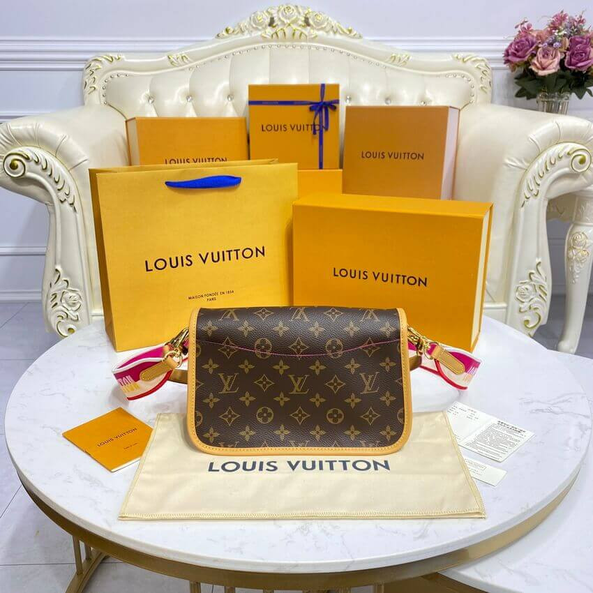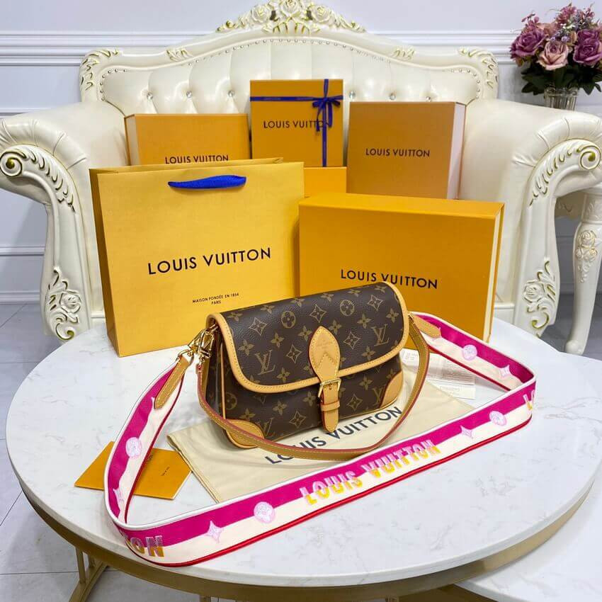 The Diane satchel in Monogram canvas revisits a classic model from the 90s, combining such vintage details as leather corners and an archival-inspired buckle with the modern functionality of smart pockets and a well-organized interior. The exclusive wide jacquard strap reverses from a bold Louis Vuitton signature to a subtle Monogram Flower motif.