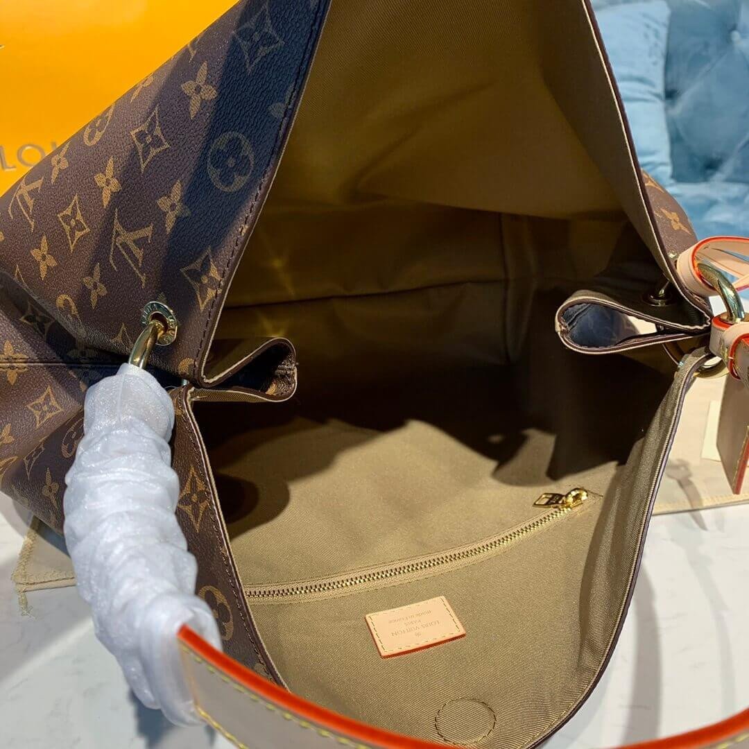 The Graceful MM hobo in classic Monogram canvas is an extra-roomy yet lightweight bag to carry every day. Natural cowhide leather detailing and shiny golden hardware add a refined, signature touch. The body-friendly design combines with a supple, flat handle for stylish and comfortable over-the-shoulder wear. The magnetic closure and zipped inside pocket keep belongings secure.