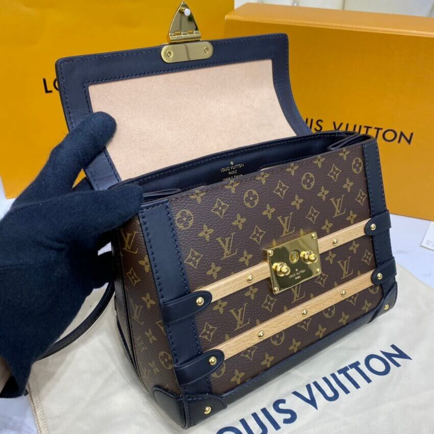 Inspired by the House’s trunkmaking legacy, Nicolas Ghesquière has created the adorable Trianon PM handbag in Monogram canvas. It’s semi-rigid construction, S-lock, and wooden and leather trim clearly evoke Louis Vuitton’s historic trunks. It has a single top handle for hand carry as well as a removable, adjustable leather strap for shoulder or cross-body carry.