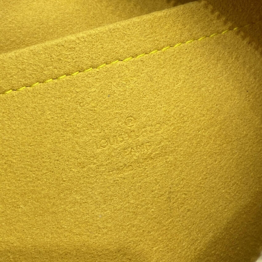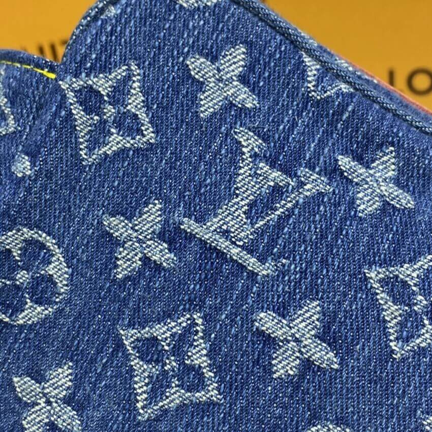 This Marc Jacobs designed bag for Louis Vuitton is crafted of stonewashed monogram blue denim. This bag features an exterior flap pocket with a brass push lock and an adjustable monogram denim waist strap with a belt buckle closure and seven notches. The top zipper opens to a yellow microfiber interior with flat and cell phone pockets.