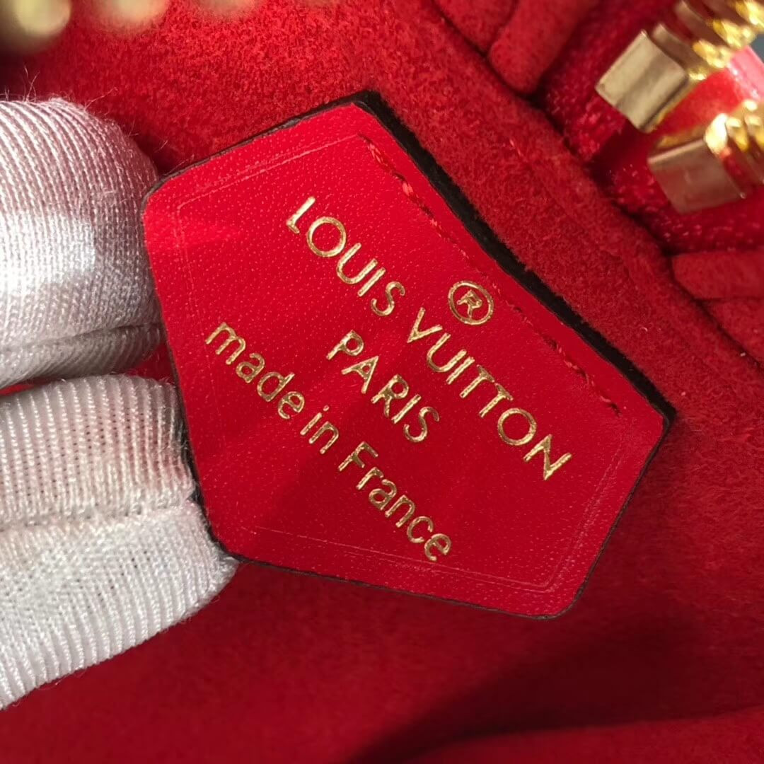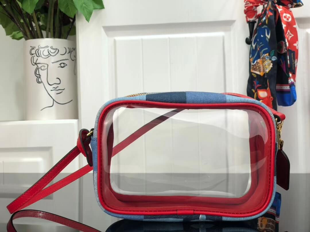 A sea- and pool-side essential, the Beach Pouch is revisited in red Monogram Denim, characterised by its pattern of patchwork squares. The design incorporates transparent PVC sides to display contents such as toiletries and a smartphone. A name tag and removable shoulder strap complete the pouch.