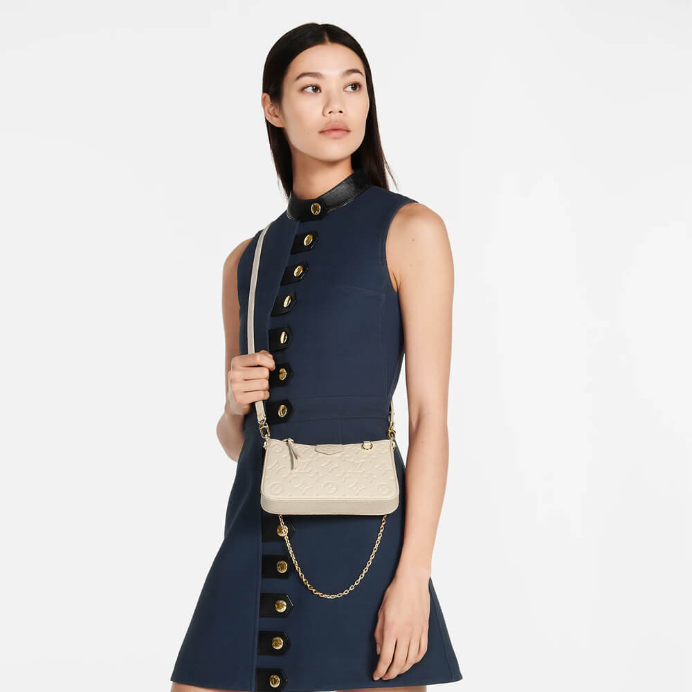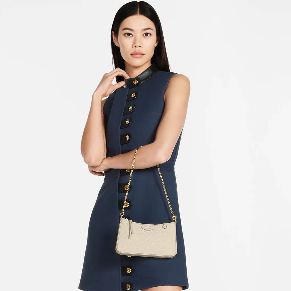 For Spring 2022, the Easy Pouch On Strap is made from Monogram Empreinte leather. The sleek design lends itself beautifully to the embossed Monogram pattern on the supple Empreinte leather. It can be worn on the shoulder, with the chain or the strap for a short carry or cross-body as the leather strap is adjustable.
