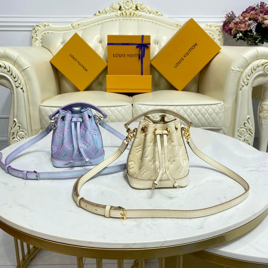 For the Summer Stardust collection, the Nano Noé is reinterpreted in supple Monogram Empreinte leather, embossed with the Monogram pattern. The leather is specially treated to create a shimmering effect inspired by starry skies. With room for everyday essentials, this miniature replica of the iconic Noé bag features a removable handle and a removable, adjustable strap for multiple carry options.