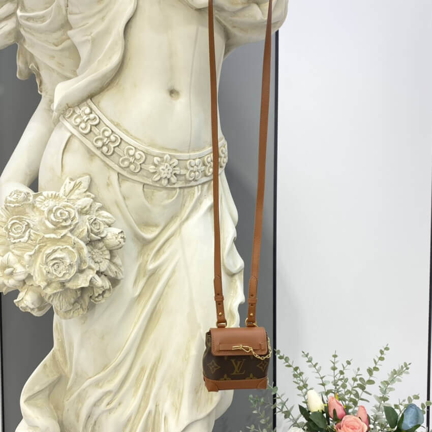 The Mini Steamer pouch is a new mini bag for Fall-Winter 2021. A contemporary appeal comes courtesy of its boxy Monogram canvas exterior highlighted with polished hardware, including an extra small chain fastening. It can be worn as a cross-body bag, belt loop pouch or a bag charm.
