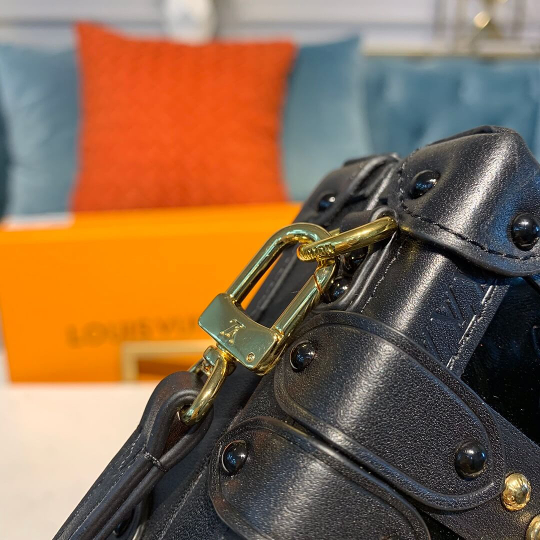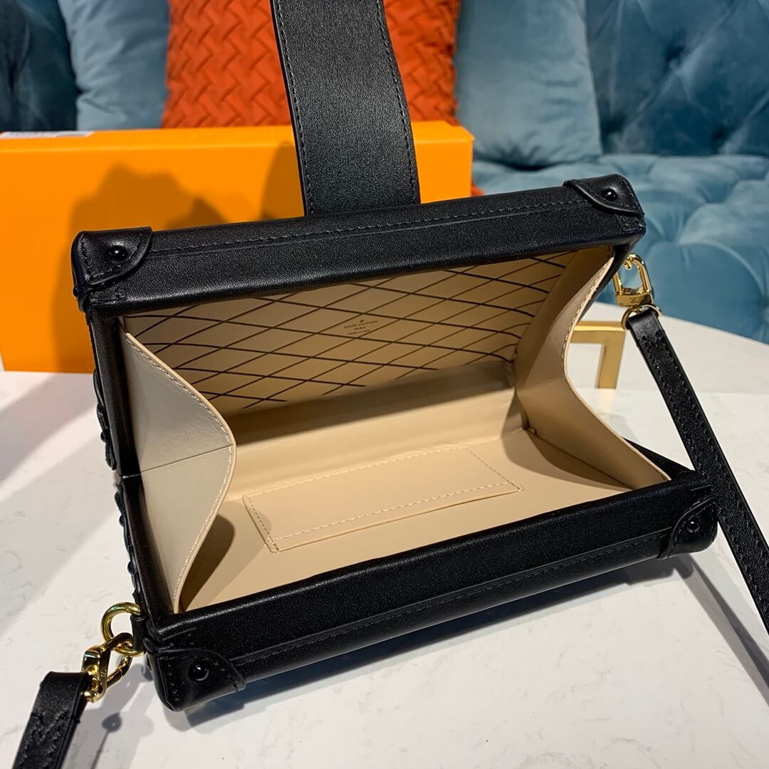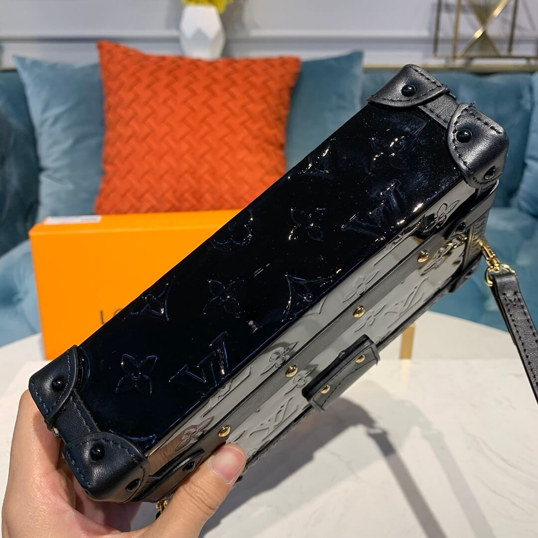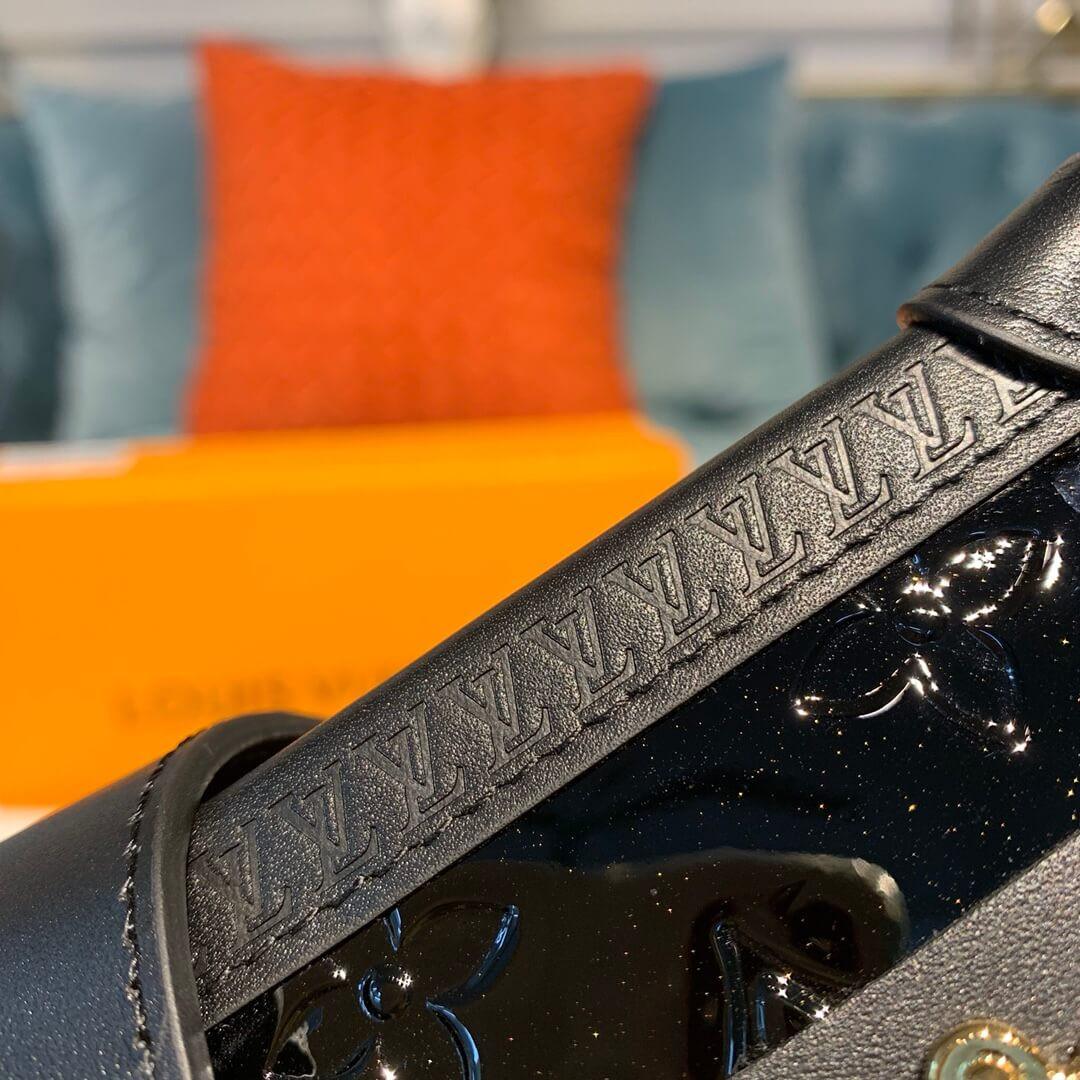 Introduced for Pre-Fall 2019, this edition of the Petite Malle is crafted from lustrous Monogram Vernis embossed patent leather. The covetable “little trunk” makes a glamorous statement with evening silhouettes, either carried as a clutch or worn on the removable leather strap. The drop can be adjusted for shoulder or cross-body wear.