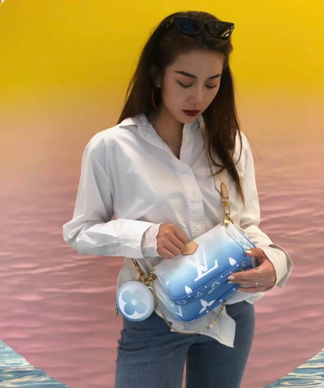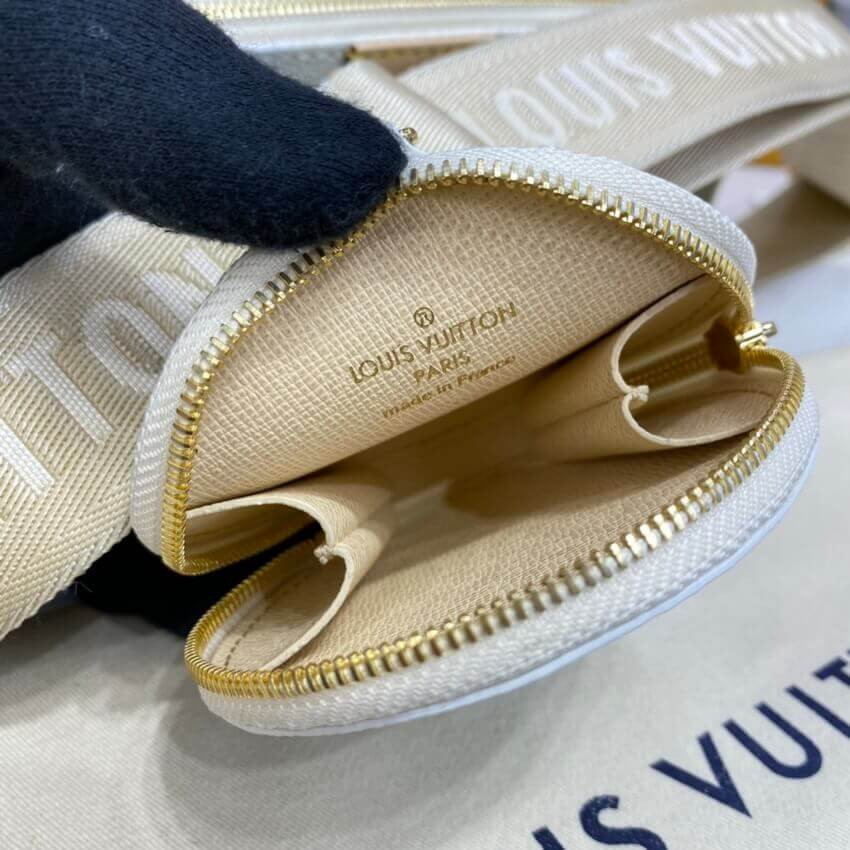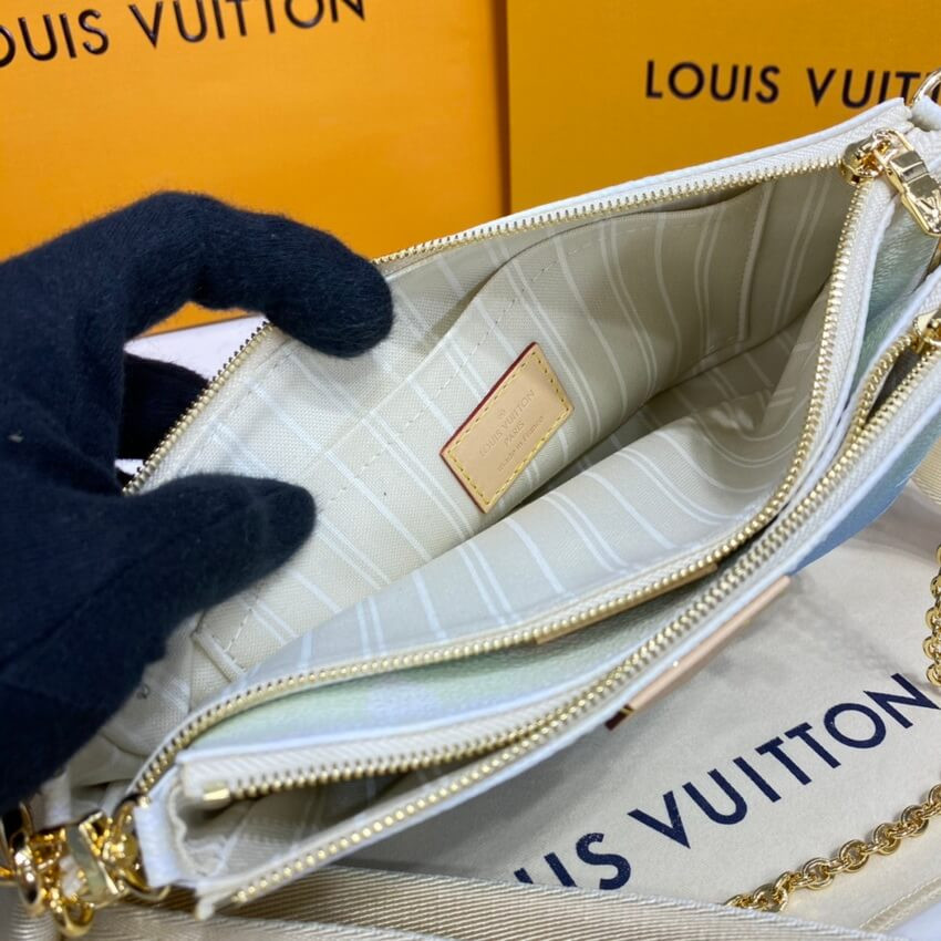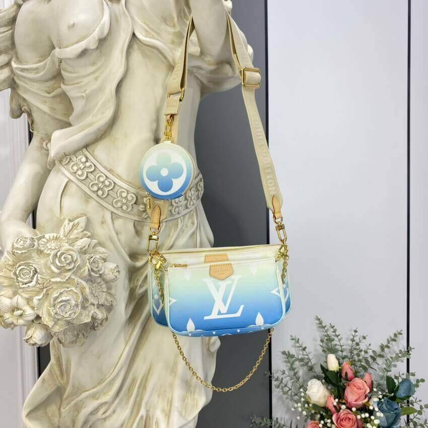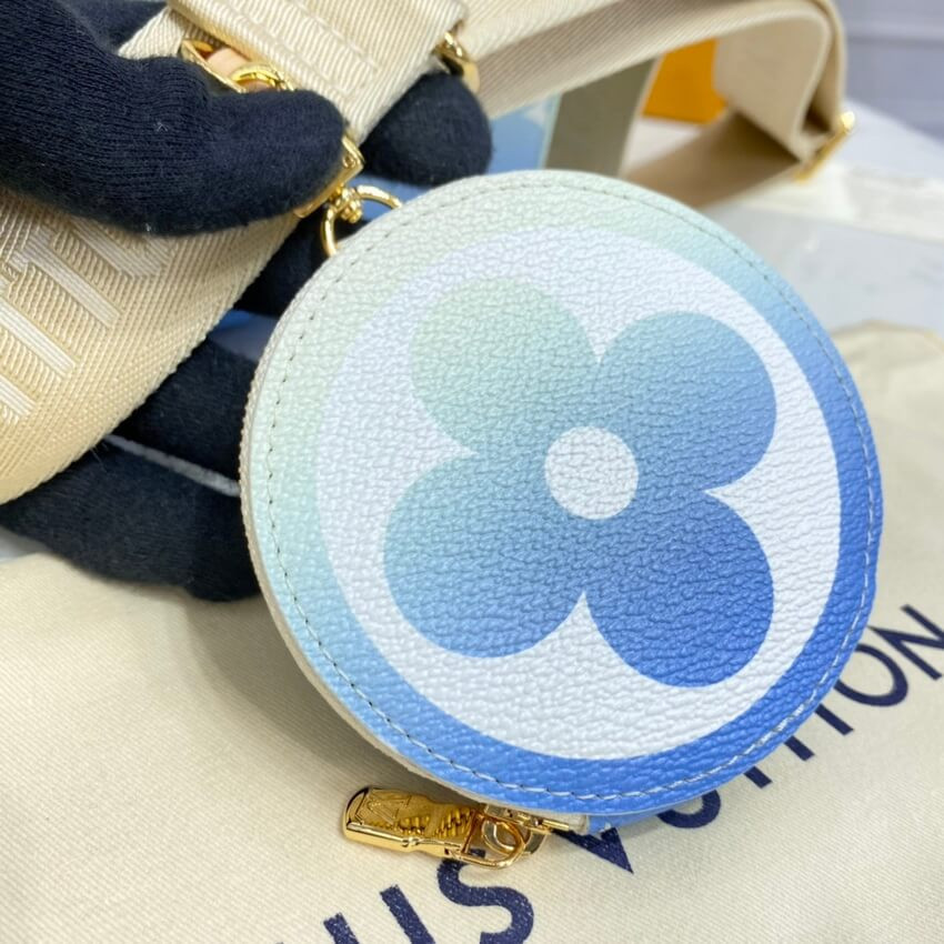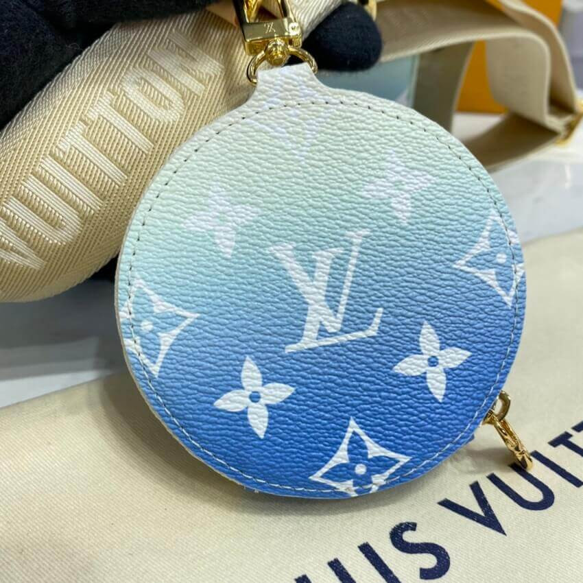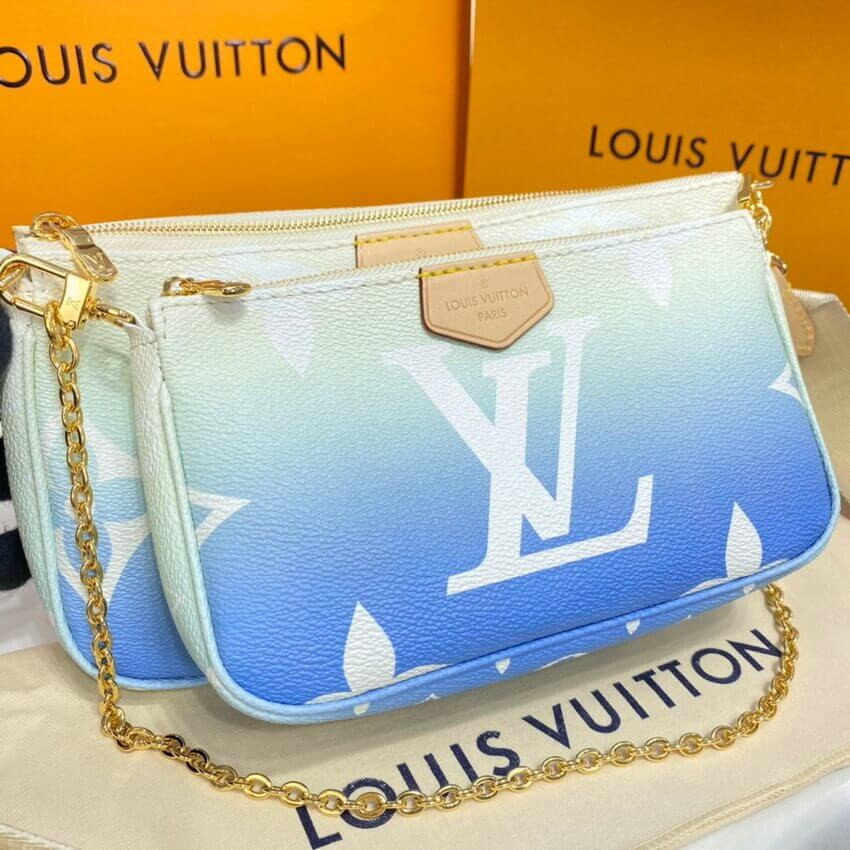 The versatile Multi Pochette Accessoires is composed of a bag, a pouch, and a round coin purse, all made from pastel-colored Monogram Giant canvas. This hybrid bag features an adjustable jacquard strap with Louis Vuitton Malletier inscribed on it for shoulder or cross-body wear as well as a removable gold-color chain for hand and short-shoulder carry.