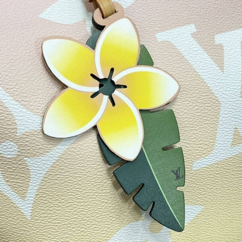 This summery Neverfull MM tote bag is made from Monogram Giant canvas in a gradient pastel colorway and is accessorized with a leather flower charm. The bag’s side laces tighten for a sleek silhouette or loosen for a more casual look. Its interior pouch can be removed and carried used as a clutch while its thin handles slip comfortably over the shoulder or arm.