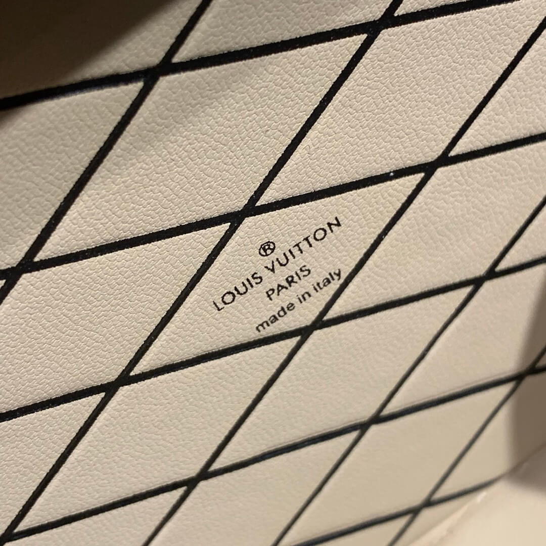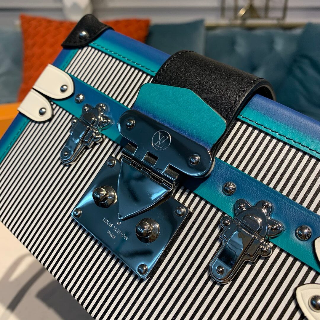 Hypnotic stripes and striking color combine on an eye-catching Petite Malle handbag, created for Spring-Summer 2019. The black-and-white vertical pattern is artfully spray-painted onto the leather of this impeccably crafted “little trunk,” which can be carried as a clutch or attached to its adjustable strap for shoulder or cross-body wear.